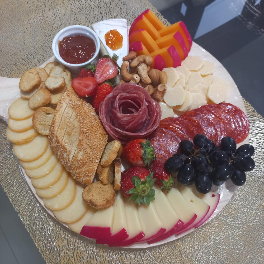 Descubra uma experiência gastronômica incrível com nossa Tábua de Frios. Cheia de sabor e variedade, ela inclui 1 unidade de queijos especiais, para aqueles que valorizam um bom queijo com história. 1 unidade de salames e presuntos, trazendo a tradição charcutaria italiana para a sua mesa. Petiscos, um mimo maior a cada mordida, e 1 unidade de frutas frescas para um equilíbrio perfeito. Para acompanhar, 1 unidade de torradas crocantes e pão artesanal fresquinho. E para finalizar com um toque doce, 1 unidade de chocolates e geleias exóticas. Mergulhe neste banquete de sabores, cores e texturas com a nossa Tábua de Frios. Obs: Nossos produtos vão de carro devido à delicadeza dos produtos e a segurança alimentar. Vai com uma linda dedicatória impressa numa folha de pergaminho e chocolates.