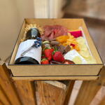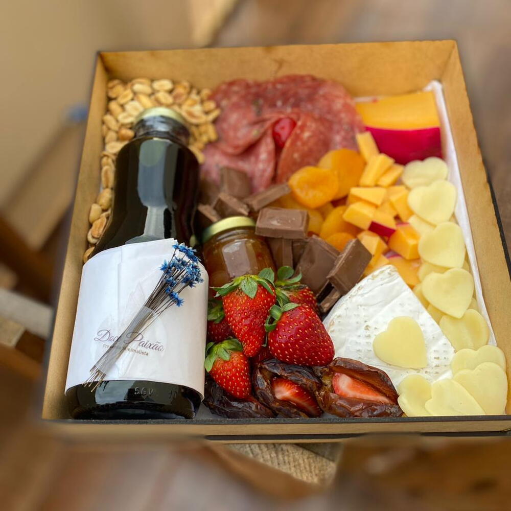 salame - 1 un. geleia - 1 un. caixa de mdf - 1 un. morango - 1 un. suco de uva integral - 1 un. foto polaroide - 1 un. damasco turco - 1 un. mussarela - 1 un. chocolate ao leite - 1 un. queijo brie podendo haver alteração - 1 un. queijo reino ou gouda - 1 un. tamara de israel - 1 un. amendoim com sal - 1 un. cereja - 1 un.
