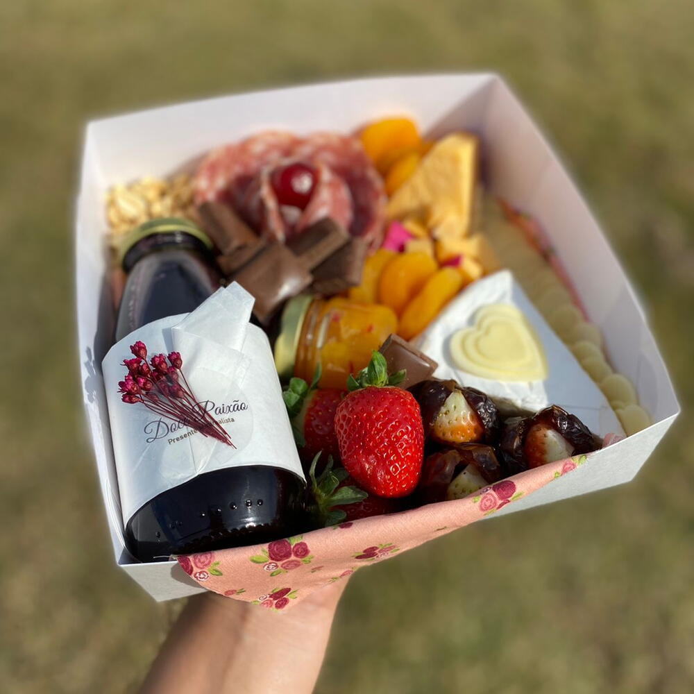 salame - 1 un. geleia - 1 un. morango - 1 un. suco de uva integral - 1 un. foto polaroide - 1 un. damasco turco - 1 un. mussarela - 1 un. chocolate ao leite - 1 un. queijo brie podendo haver alteração - 1 un. queijo reino ou gouda - 1 un. tamara de israel - 1 un. amendoim com sal - 1 un. cereja - 1 un.