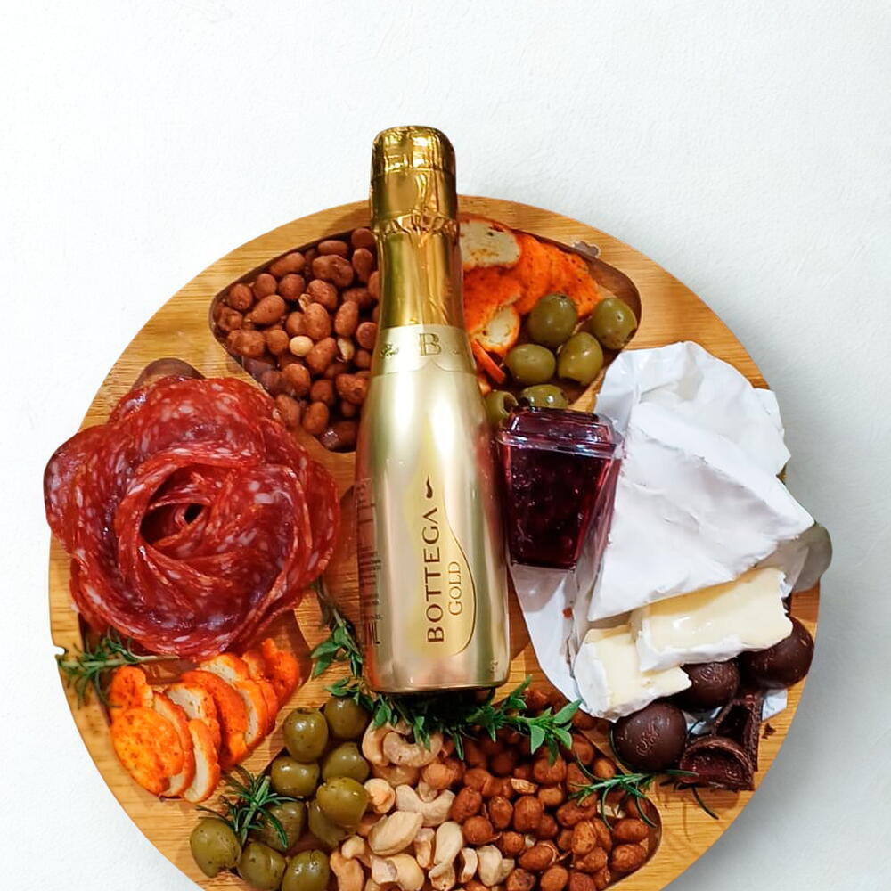 Deguste a nossa Tábua Happy Hour, um verdadeiro deleite para os amantes de petiscos finos. Esta cesta inclui uma lindíssima tábua redonda de madeira, repleta de deliciosos sabores para seu deleite. Temos uma porção generosa de salame, acompanhada de uma seleção de queijos frescos. Acompanha uma porção de geleia doce e suave, perfeita para equilibrar os sabores. A tábua também inclui quatro decadentes bombons recheados com licor de cereja, para um final de degustação irresistível. Além disso, há duas porções mistas de azeitonas, castanhas, amendoins e bruschettas crocantes. Para completar, um espumante Bottega Gold Prosecco 200ml, que adiciona um toque de sofisticação a qualquer ocasião. Desfrute!