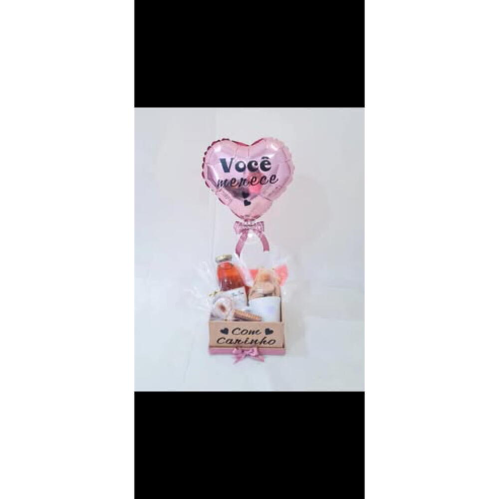 sachê de rosca doce - 1 un. garrafinha de chá sabor variado 300ml - 1 un. sachê de biscoito de canela e maçã - 1 un. sachê de biscoitos finos doce - 1 un. sachê de biscoito coberto com chocolate - 1 un. caneca porcelana pequena - 1 un. caixa mdf personalizada - 1 un. balão metalizado personalizado até 2 palavras - 1 un.