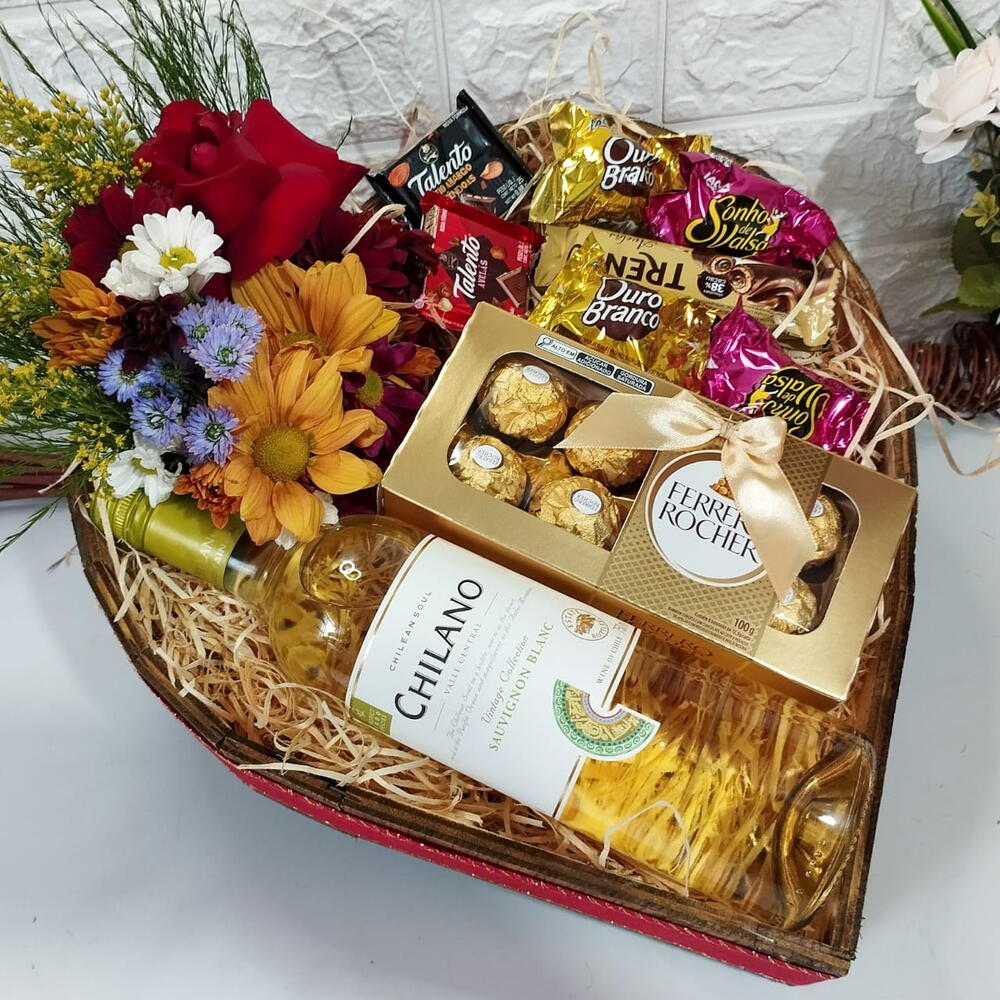 Um surpreendente e lindo presente exclusivo pra datas especiais como hoje! Encanto e beleza em um só presente. Contém: 01 Arranjo floral c/botão de rosa (flores reais naturais) 01 Vinho Fino branco 01 Cx. De Ferrero Rocher 02 Bombons Ouro Branco 02 Bombons Sonho de Valsa 01 Trento avelã 01 Talento avelã 1 Talento amêndoas E muita dose de carinho é claro.