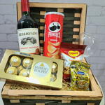Este presente inclui uma combinação de delícias que promete agradar ao paladar de quem o receber. O conjunto é composto por 8 unidades de Ferrero Rocher, um pacote de castanhas de caju e um de amendoins, que são perfeitos para desfrutar como aperitivo. Acompanha uma garrafa de vinho de boa qualidade, perfeitamente harmonizada com uma taça inclusa para apreciação imediata. Para completar, há um pacote de batatas Pringles, oferecendo um toque salgado e crocante para o lanche. É uma ótima opção de presente para ocasiões especiais!
