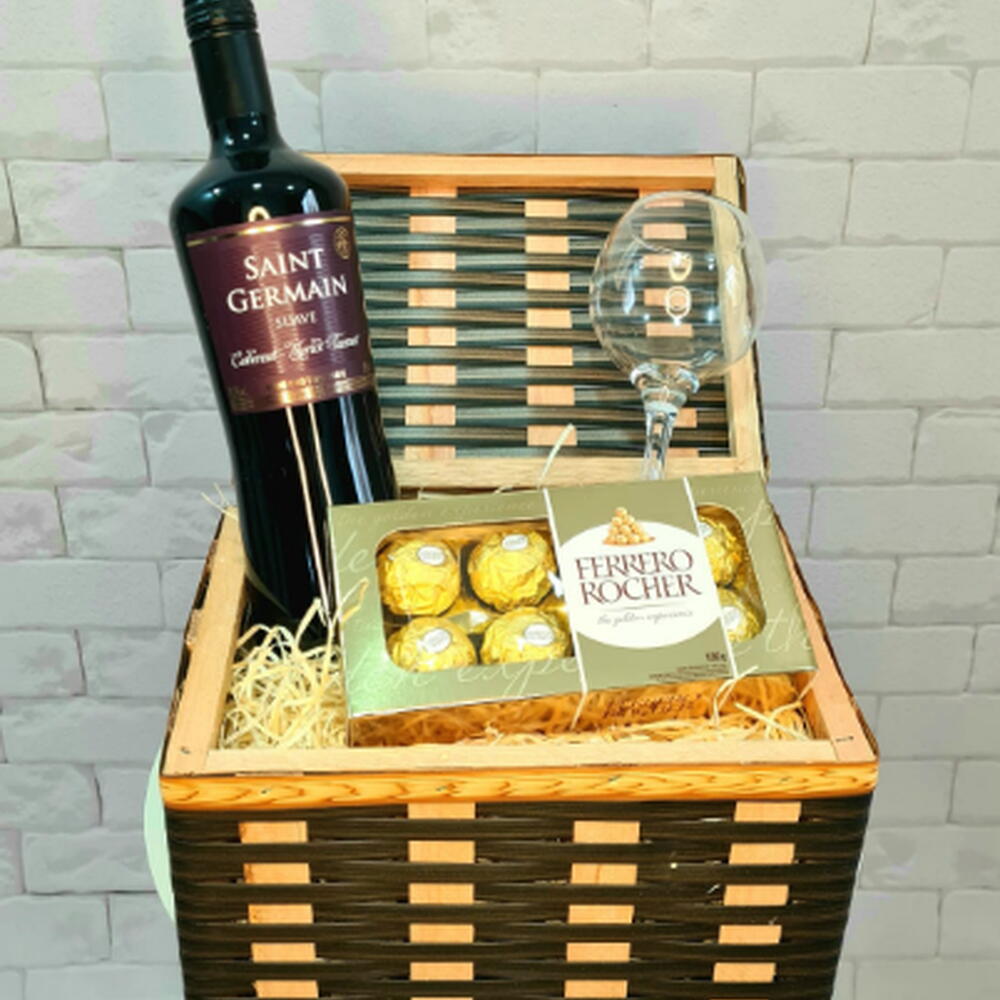 Este presente sofisticado VIP vem com um exclusivo vinho de primeira qualidade, às vezes agradável e refrescante, às vezes robusto e encorpado, dependendo da sua escolha. Acompanhando o vinho, temos oito unidades do irresistível bombom Ferrero Rocher, conhecido por sua casca crocante, seu delicioso recheio cremoso e a avelã inteira no centro. O presente também inclui uma elegante taça de vidro, perfeita para desfrutar o vinho. A palha decorativa e a cesta complementam este conjunto, tornando-o uma opção de presente pronta para impressionar e agradar em qualquer ocasião.
