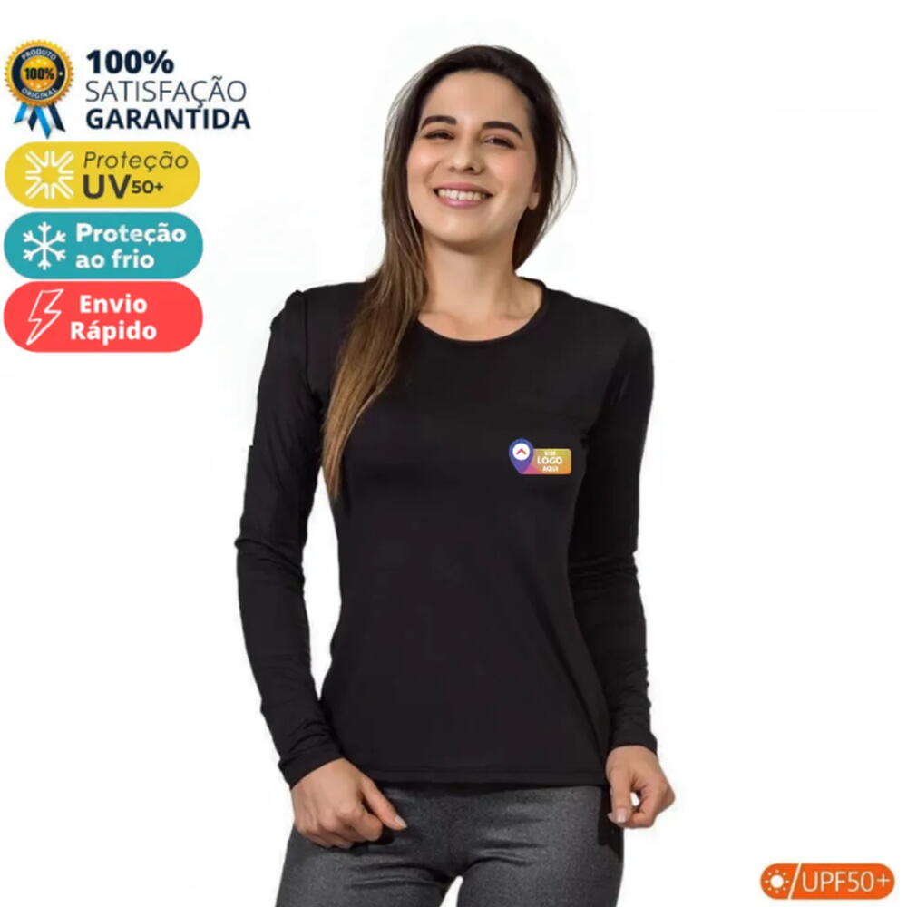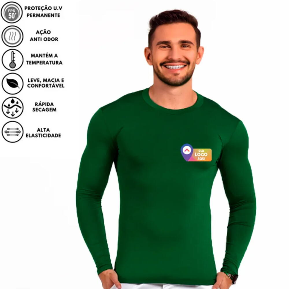 Camiseta Térmica UV 50+ com Fator de Proteção Solar e Personalização da sua Logo ou desenho -o produto Inclui 1 logo ou desenho personalizado. Nossa camiseta térmica foi desenvolvida com tecnologia de ponta para garantir proteção solar eficaz UV 50+, bloqueando até 99% dos raios UV-A e UV-B, ideal para quem pratica esportes ao ar livre ou trabalha exposto ao sol. Com 90% de Microfibra de Poliéster e 10% de elastano, ela proporciona alto conforto, elasticidade e durabilidade, mantendo o frescor com seu tecido leve e respirável. Pedido mínimo 5 camisas personalizadas. O valor inclui apenas 1 impressão de logo ou desenho por camisa - Para mais de uma impressão (por camisa) entre em contato Essa camisa UV é feita de malha fria e oferece excelente proteção solar para dias ensolarados. Sua versatilidade a torna ideal como camisa térmica, camiseta de proteção solar e segunda pele UV, garantindo estilo e funcionalidade para quem busca segurança e conforto em atividades ao ar livre. Com fator de proteção UV permanente, nossa camiseta permanece eficaz após várias lavagens, garantindo proteção contínua. Leve e de secagem rápida, ela ajuda a manter o corpo fresco e seco em dias quentes. Disponível em manga longa, oferece cobertura completa contra raios solares, sendo perfeita para quem busca proteção solar UV de alta qualidade. Medidas aproximadas (Tamanho adulto padrão): P: Comprimento 69 cm | Largura 46 cm M: Comprimento 71 cm | Largura 48 cm G: Comprimento 74 cm | Largura 50 cm GG: Comprimento 78 cm | Largura 52 cm