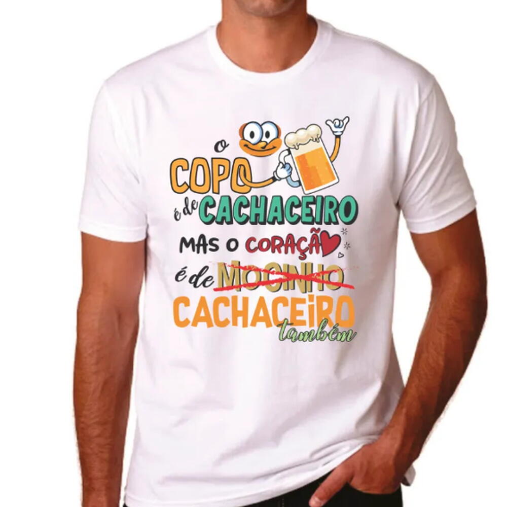 Camiseta "O Copo e de Cachaceiro(a), mas o Coração e de Cacheiro(a) tambem" (malha de poliester)