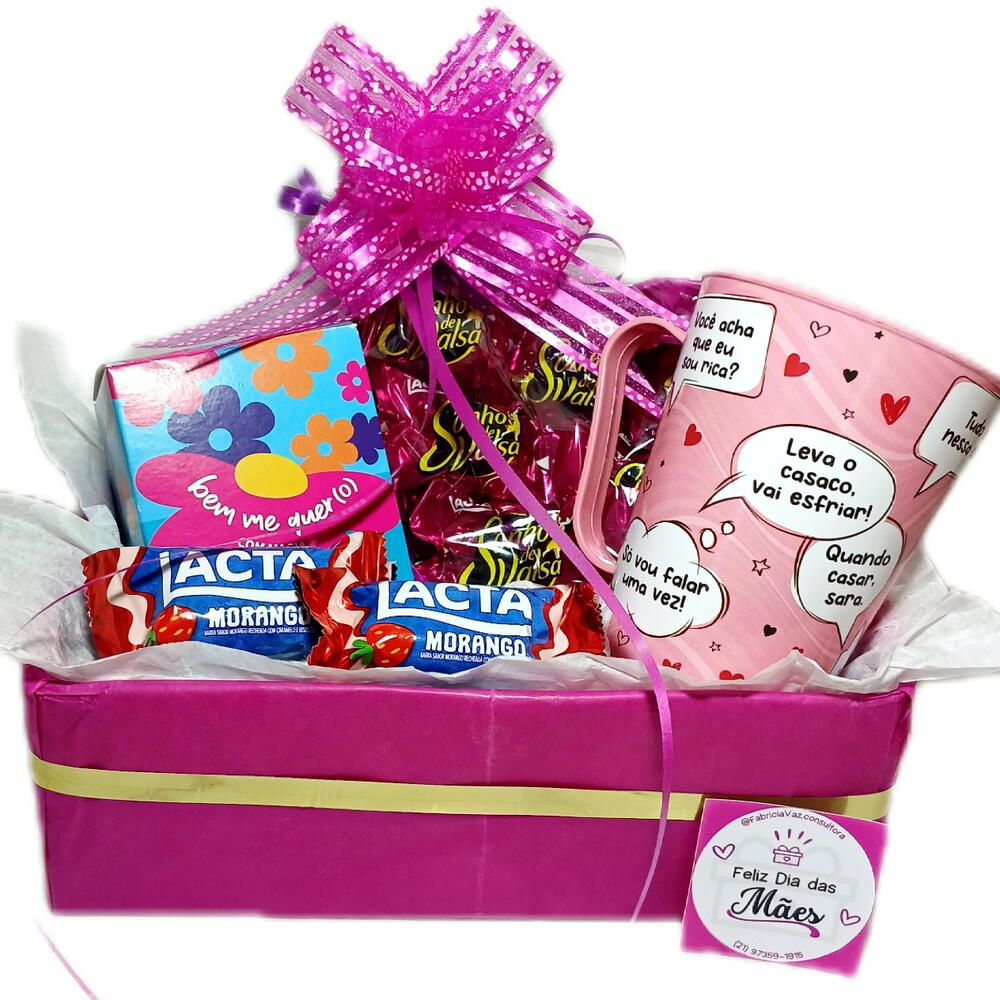 Tem presente que a gente olha e já imagina o sorriso dela, né? Essa cesta foi pensada para ser um ritual de amor. Ela começa o Dia com um café na caneca exclusiva, sente o aroma delicado da Colônia Bem-me-quer e aproveita a doçura dos bombons Sonho de Valsa e Morango. A apresentação em rosa e dourado traz a elegância que o Dia das Mães pede. É mais que um presente, é um obrigado por tudo em forma de mimo. Contém: *Colônia Bem-Me-Quer Magia 100ml Jequiti *Coração c/6 Bombons Sonho de Valsa *Caneca plástica Frases de Mãe 430ml *2 Bombons Morango Lacta. Embalado com celofane transparente e laço. Compre já!