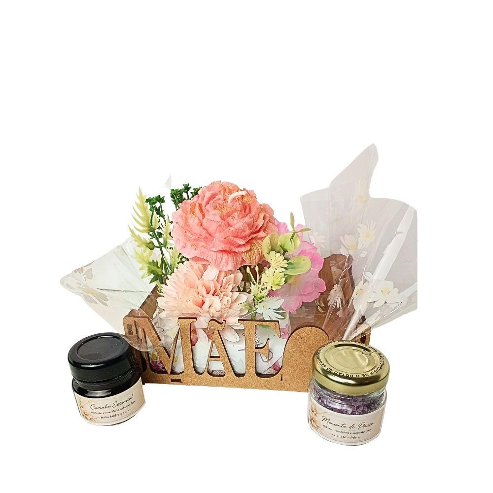 Proporcione à sua mãe um refúgio particular de paz. Este kit foi desenvolvido para transformar o final do dia em um momento de cura e desconexão. A experiência começa com a Vela de Peônia Aberta, uma peça artesanal de beleza escultural que perfuma o ambiente enquanto decora. Para o cuidado físico, o Escalda-Pés Artesanal combina o poder calmante da Camomila, o vigor do Hibisco e a limpeza energética das raspas de Palo Santo, tudo envolvido por um blend de óleos essenciais de Lavanda e Rosas. Para finalizar o ritual, o Balm Ultra-Hidratante (com base de cera de coco e óleo de rosa mosqueta) recupera a maciez dos pés, deixando o toque aveludado e o aroma exótico e nutritivo do Buriti. Um presente completo que abraça e renova.