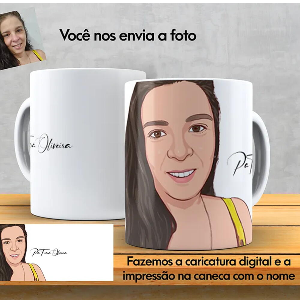 Caneca de Porcelana Personalizada com Caricatura e Nome – 325ml Surpreenda com uma caneca de porcelana personalizada com caricatura digital colorida e nome! Esse presente criativo e original, feito em cerâmica branca de 325ml, é perfeito para dar um toque de humor e exclusividade a qualquer momento especial. Com a estampa de uma caricatura divertida e a possibilidade de adicionar nomes personalizados, essa caneca se torna o presente ideal para aniversários, casamentos, formaturas, Dia dos Pais, Dia das Mães, entre outras datas comemorativas. Além de receber a caneca personalizada com arte exclusiva, você também receberá a caricatura digital em formato JPEG enviada diretamente por e-mail ou WhatsApp. Isso permite que você utilize a arte em outras aplicações, como impressão em quadros, camisetas ou até mesmo como papel de parede para celular e computador.