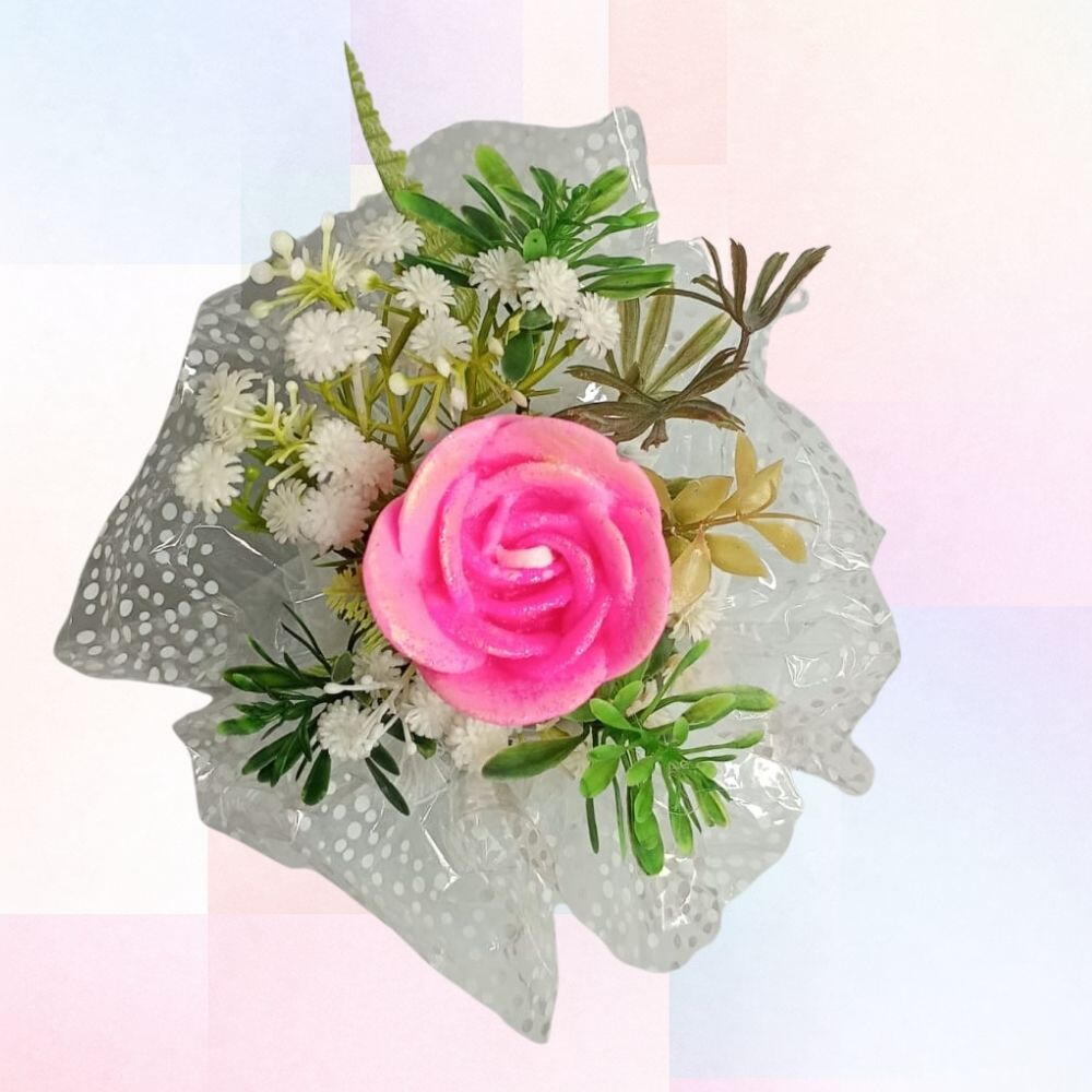 Vela cera botão de rosa com pavio Arranjos complementares de folhas, flores artificiais Involucro transparente com estrelinhas brancas Laço dourado