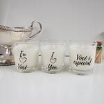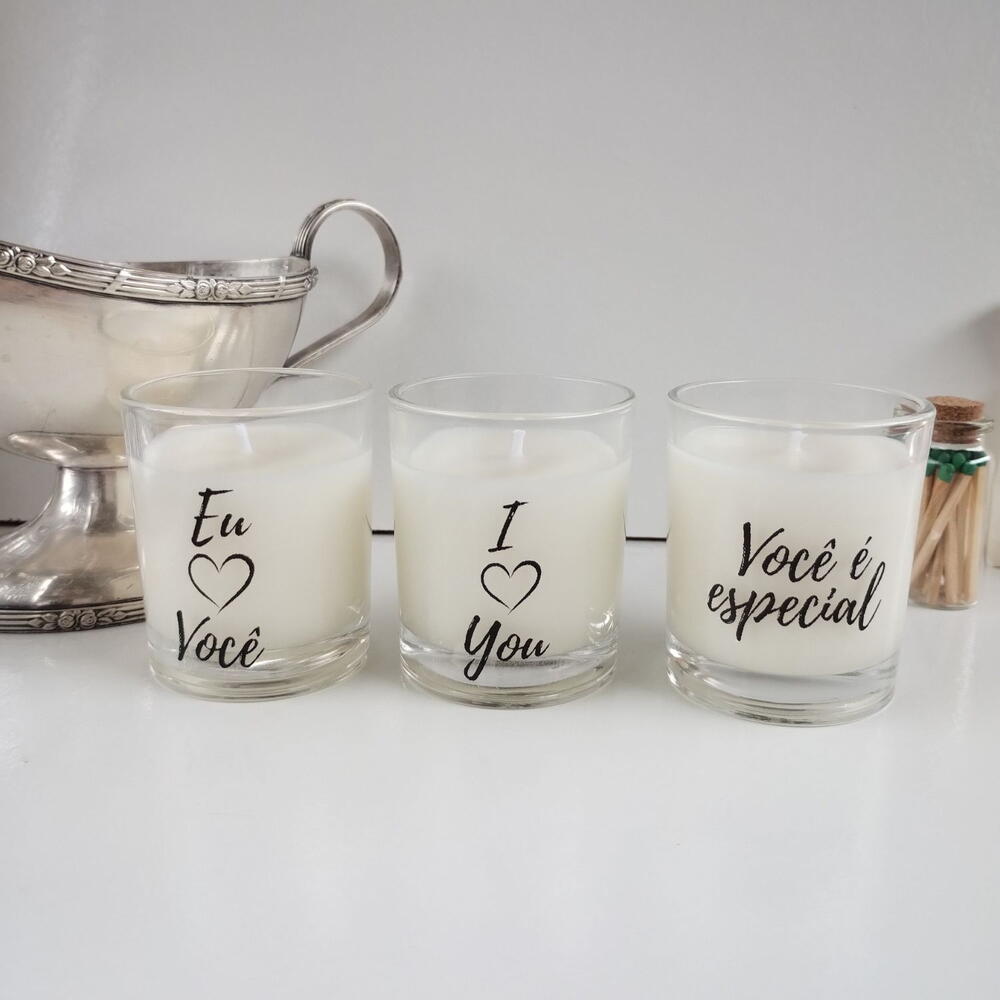 Lindas frases cada uma com um aroma único. Muito utilizada para aniversario e presentar a pessoa amada. 3 velas de 50 gramas Aromas --Atlantic - Brisas do mar - Lembra aquele cheiro de resort à beira-mar, brisa oceânica do mar Bamboo - Lembra - aquela sensação de pós-banho, ambiente recém-limpo e perfumado, como entrar em um spa ou jardim após a chuva -Cinnamon - Lembra aquele cheirinho de bala de canela, chá de maçã com especiarias que aquecem nos dias frio