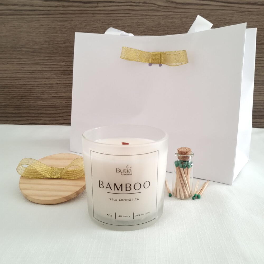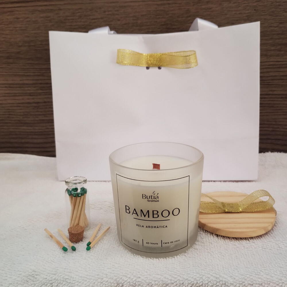 Kit Vela Aromática Bamboo 190g – Frescor e leveza com toque natural de flores e natureza 🌿 ✨ Conteúdo do kit: 🕯️ Vela Aromática Perfumada Bamboo (190g) – Feita com cera de coco, pavio de madeira e perfume de alta performance. 🔥 Mini frasco com palitos de fósforo – Detalhe charmoso e funcional. 💚 1 saquinho com wax melts – Perfeitos para aromatizar pequenos espaços. Transforme o ambiente com o frescor e a elegância da fragrância Bamboo, que combina o perfume das flores brancas e notas verdes em perfeita harmonia. Um aroma sofisticado que transmite tranquilidade, limpeza e renovação, como um jardim florido após a chuva. 🌸 Fragrância: Notas de limão, menta e folhas de bambu, com toque floral de jasmim, gerânio e lírio-do-vale, finalizando com fundo de cedro e musk. Evoca a sensação de flores frescas e natureza viva, ideal para criar um clima de spa em casa. 💫 Curiosidade: O bambu simboliza força, prosperidade e equilíbrio — perfeito para presentear quem você ama