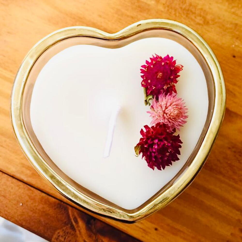 Pavio de algodão Cera vegetal de coco Aroma pitanga negra Recipiente de vidro em formato de coração e trabalho em dourado