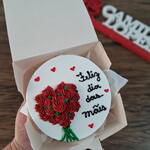 Mini bolo 10cm de diâmetro 2 discos de massa 1 camada de recheio Embalagem de isopor Embalagem kraft E laço em fita de cetim Acompanha colher descartável