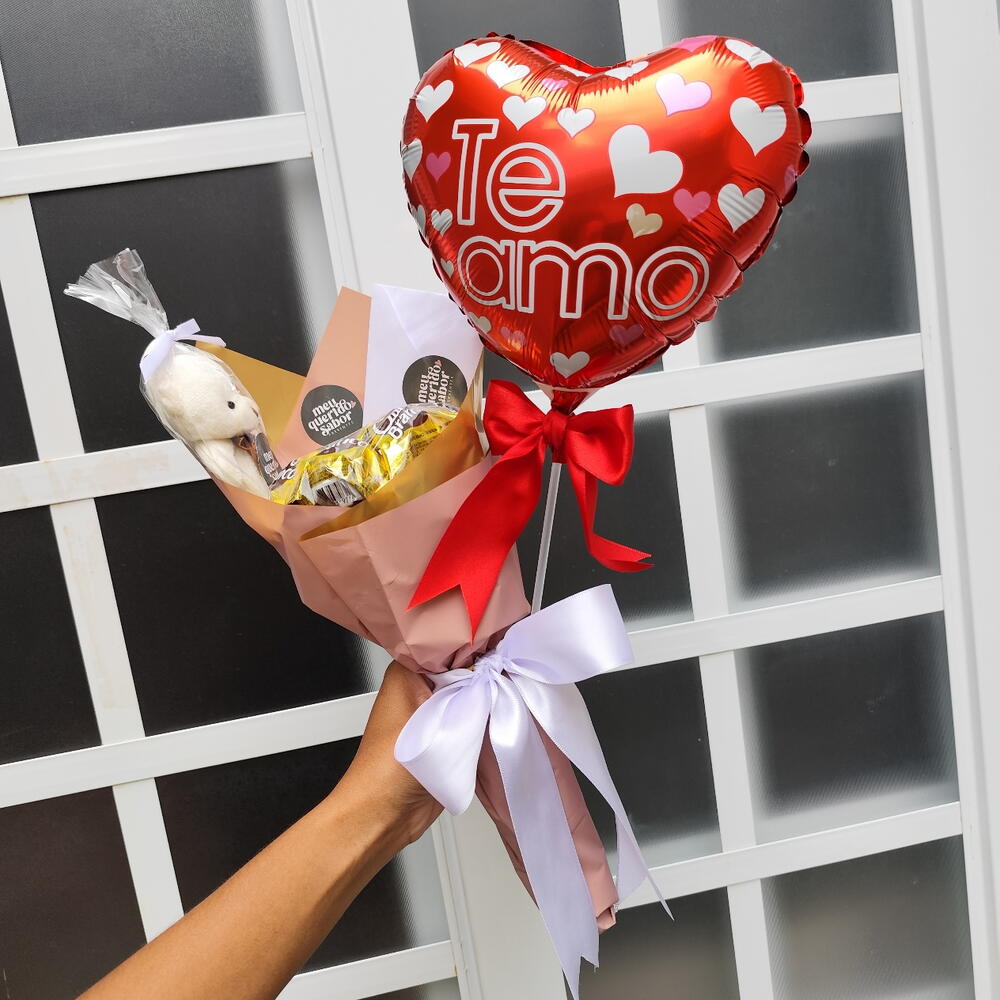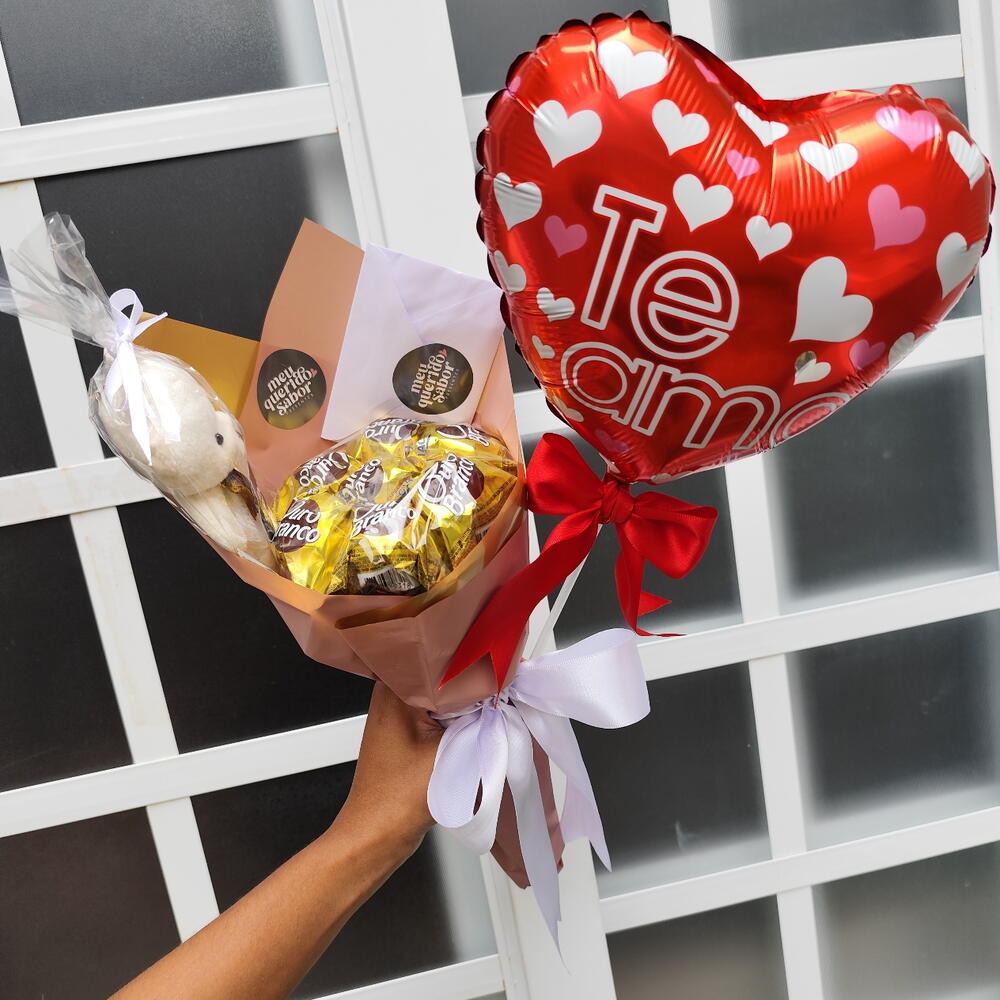 Buquê de Bombons Ouro Branco ou Sonho de Valsa Bombonzinho + Pelucia, Balão coração e Bilhete