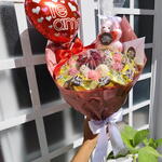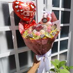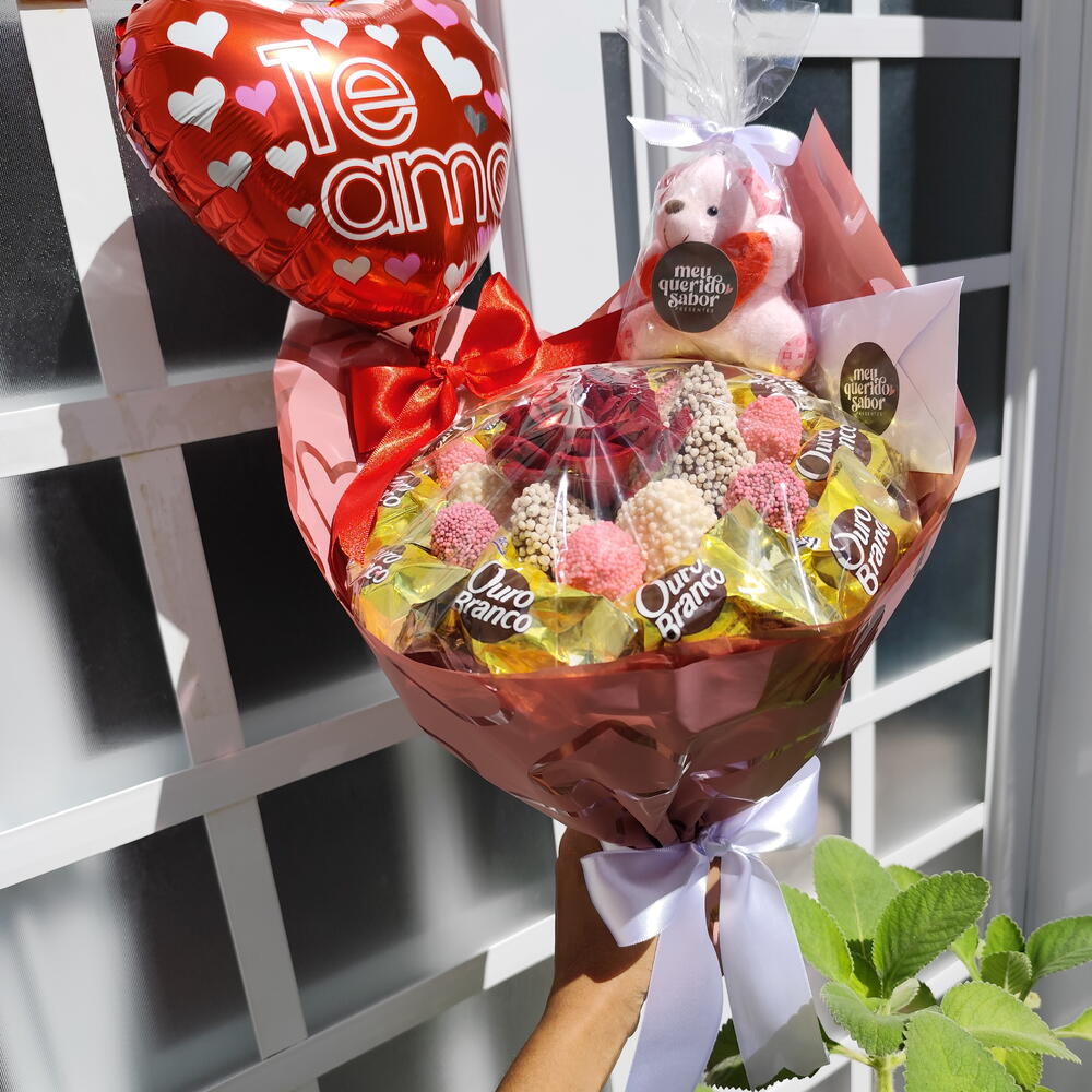 Buquê com 6 morangos e 6 uvas banhados em chocolate (branco, preto ou misto), granulado vermelho, rosa ou azul, 10 bombons Ouro Branco, Sonho de Valsa ou mesclado, e 1 rosa artificial aveludada em embalagem premium, proteção transparente e laço. Bilhete impresso com envelope + mini ursinho de chaveiro + balão coração.