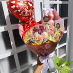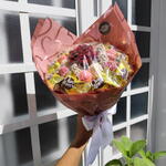 Buquê de chocolate com morangos, uvas e bombons Doçuras + Pelucia, Balão coração e Bilhete