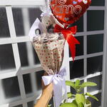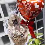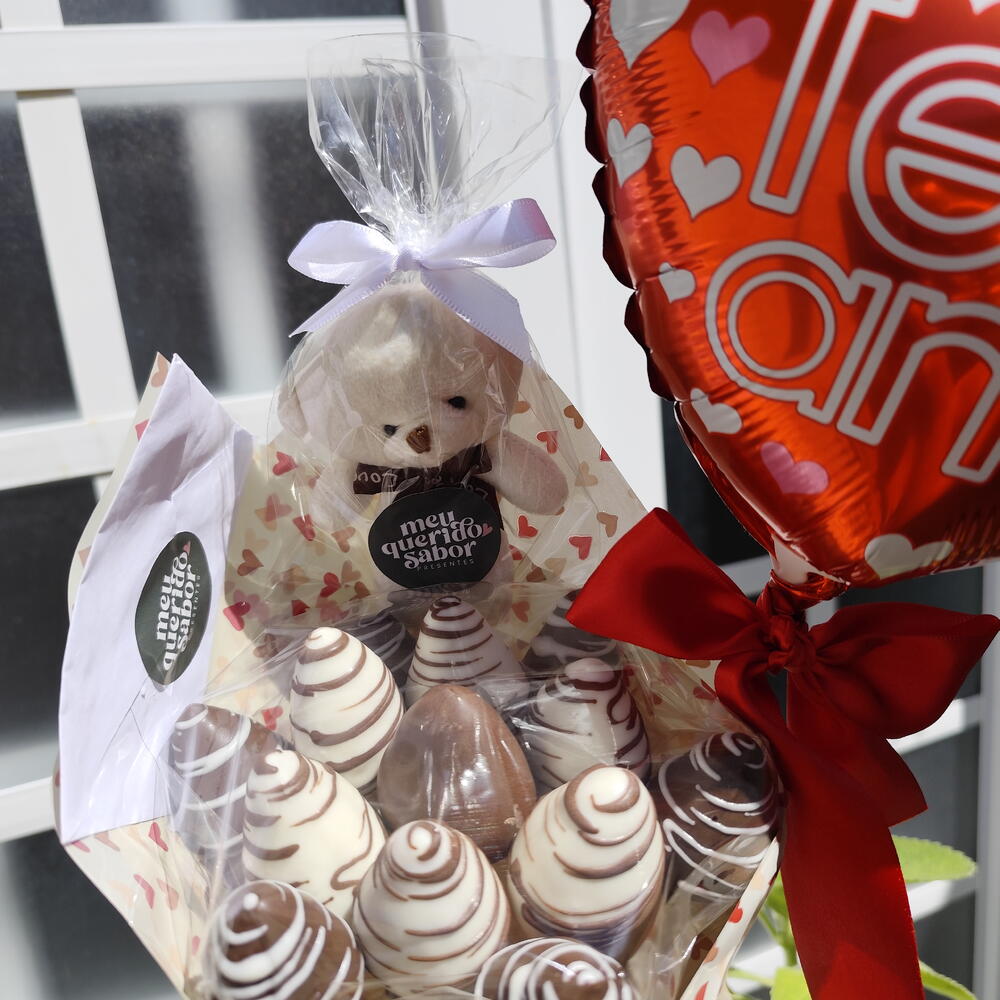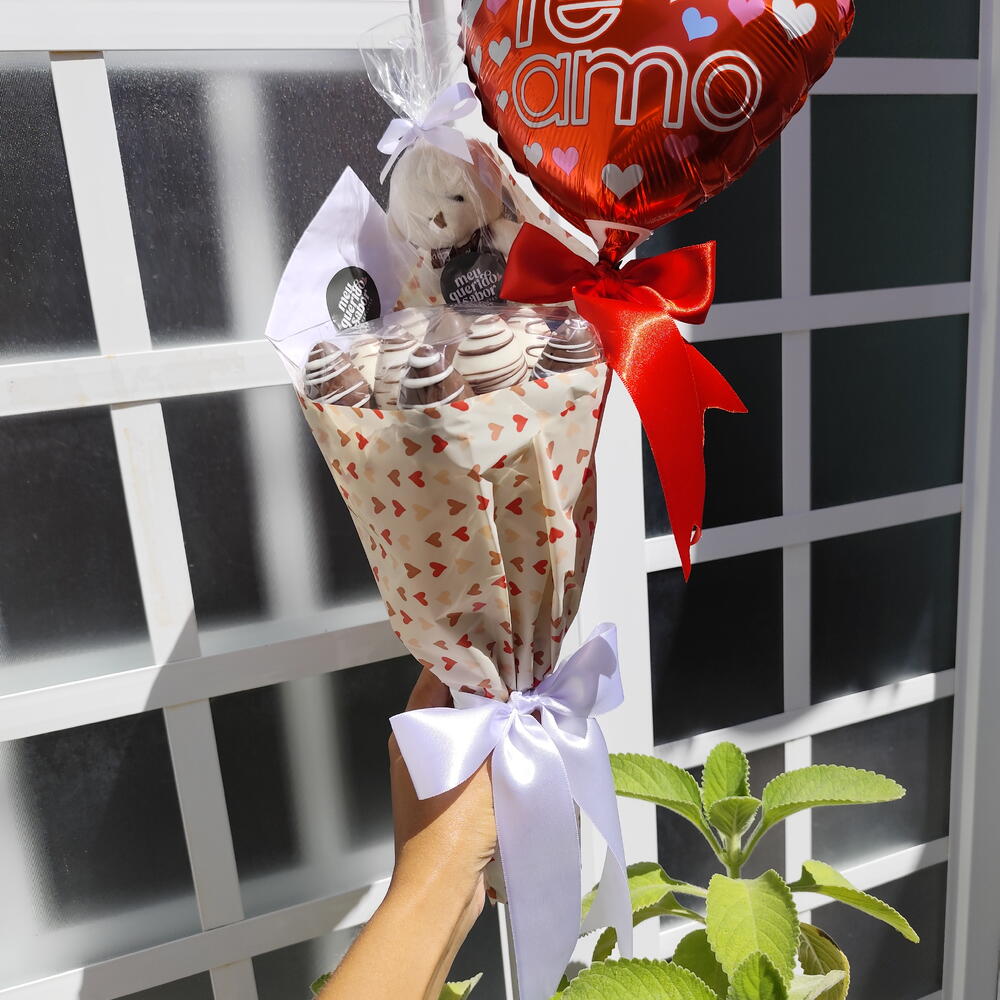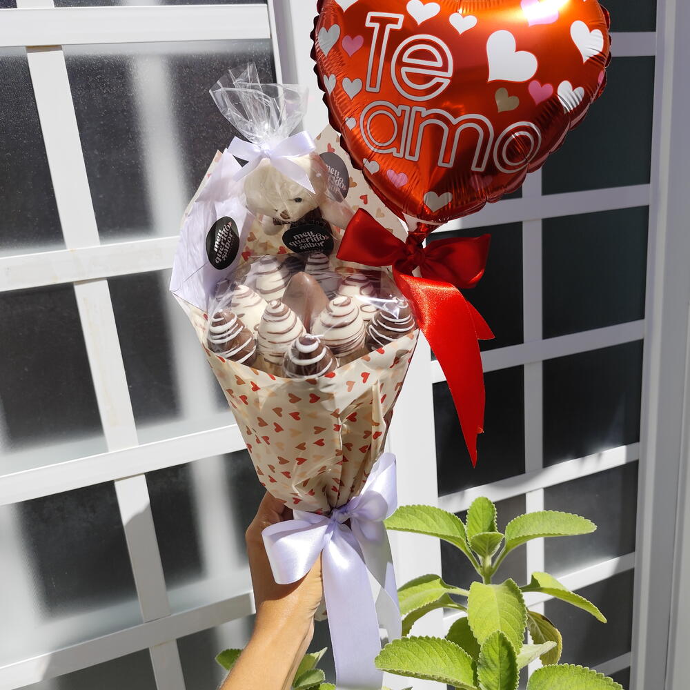 Buquê de chocolate com morangos Felicidade + Pelucia, Balão coração e Bilhete