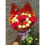 Buquê com 6 morangos banhados em chocolate (branco, preto ou misto), 12 Ferrero Rocher e 4 rosas artificiais aveludadas, em embalagem premium, proteção transparente e laço. Bilhete impresso com envelope.