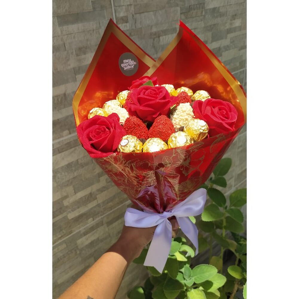 Buquê com 6 morangos banhados em chocolate (branco, preto ou misto), 12 Ferrero Rocher e 4 rosas artificiais aveludadas, em embalagem premium, proteção transparente e laço. Bilhete impresso com envelope.