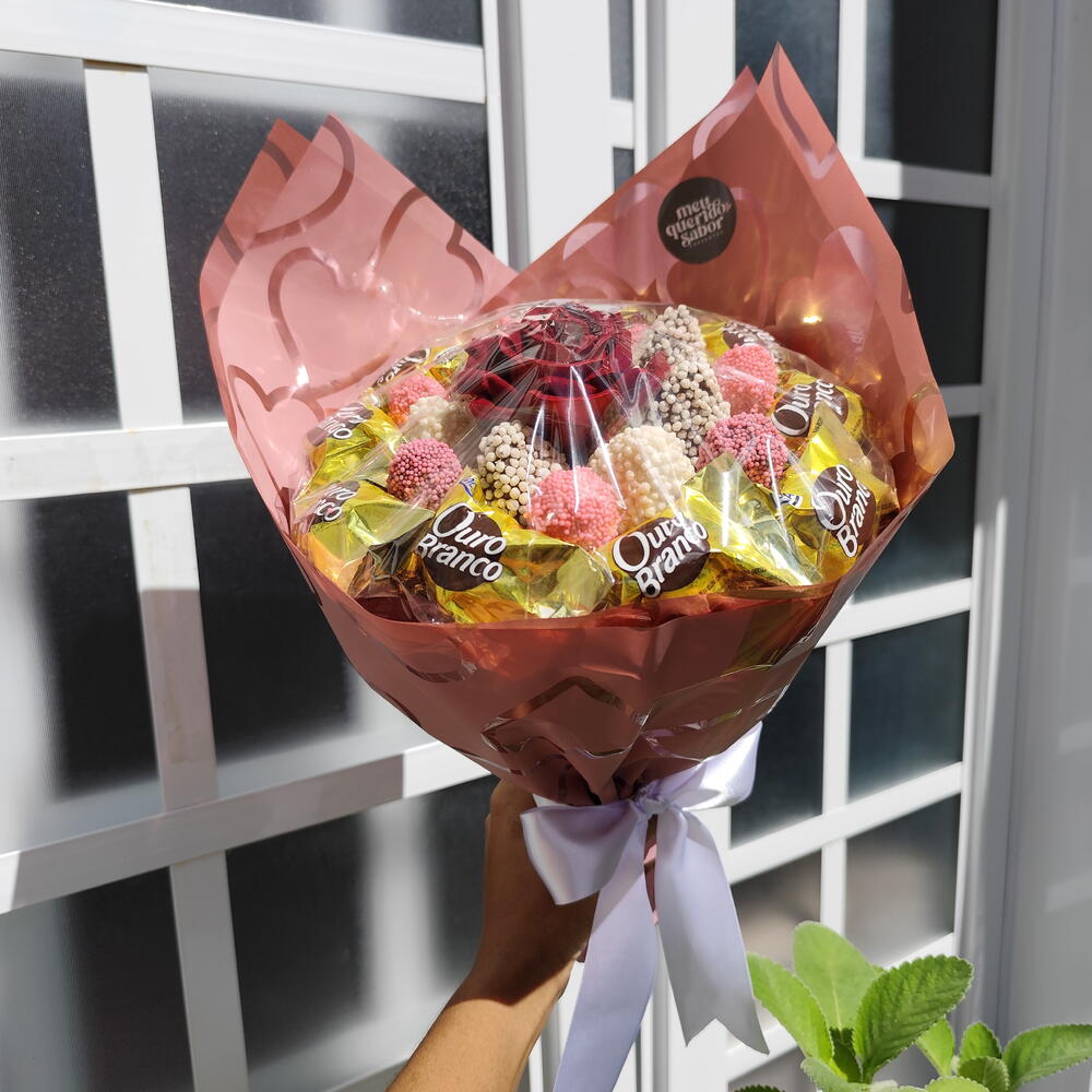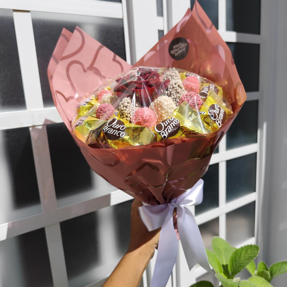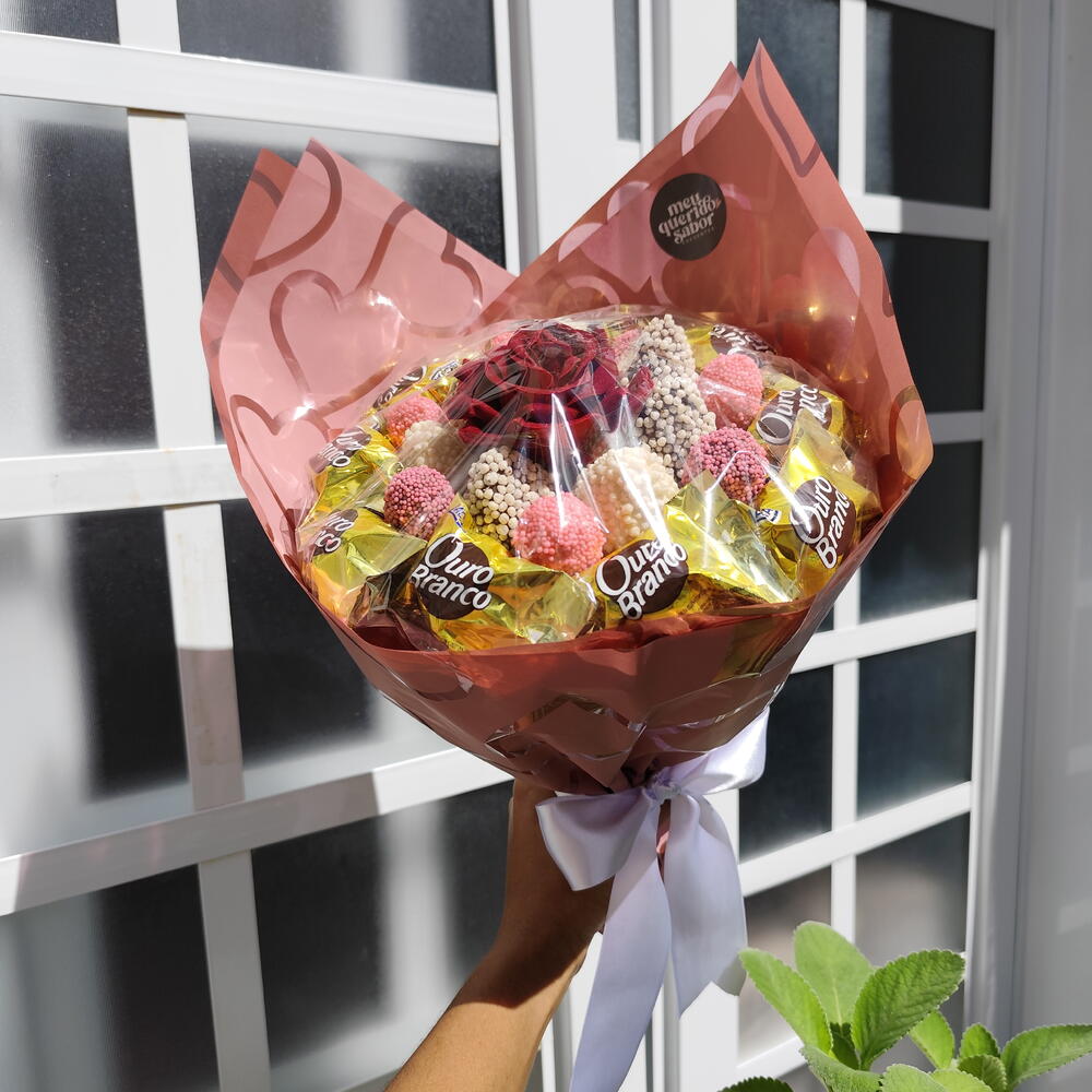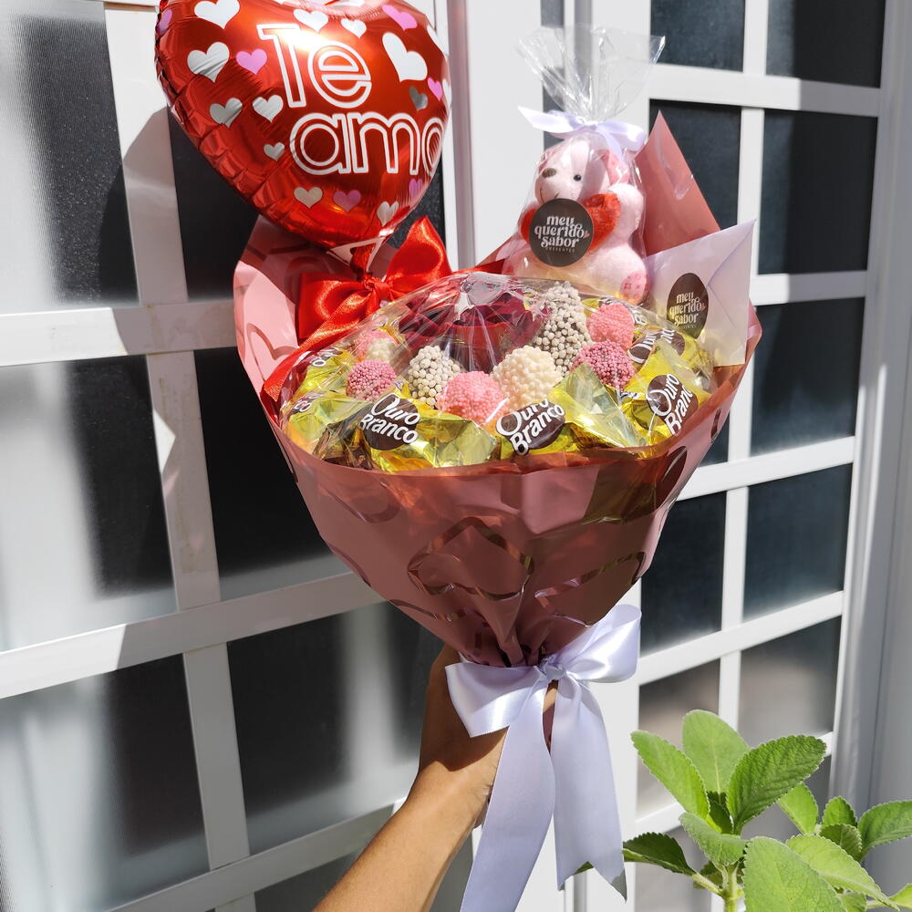Buquê de chocolate com 7 morangos banhados em chocolate (branco, preto ou misto) e 12 bombons Sonho de Valsa ou Ouro Branco, montado em embalagem premium para presente. Informações importantes: • Manter refrigerado • Consumo indicado imediato ou em até 24h • Embalagem pode variar conforme estoque • Todos os buquês acompanham proteção transparente para o alimento - Envie os dizeres do bilhete no chat (bilhete impresso com envelope branco) Presente ideal para Valentine’s Day, Dia dos Namorados, Dia das Mães, Dia Internacional da Mulher, aniversários, pedidos de desculpas e datas especiais. Uma opção criativa para quem deseja sair do tradicional de floricultura, flores e cestas de café da manhã ou cesta de chocolate.