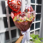 Buquê de Chocolate com Morangos e Bombons Sonho + Pelucia, Balão coração e Bilhete