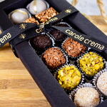 Uma linda caixa com 12 docinhos! Caixinha praline: casquinha delicada de chocolate, brigadeiro cremoso e cobertura crocante; fondant de nozes: tradicional massa do camafeu de nozes com casquinha finissima de fondant; docinho de pistache: feito a base de ovos e pistaches selecionados. Peso aprox: aprox