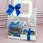 Sacola transparente com naked cake e brigadeiros. Voce pode escolher as cores das fitas para compor a decoração do item