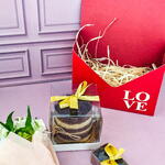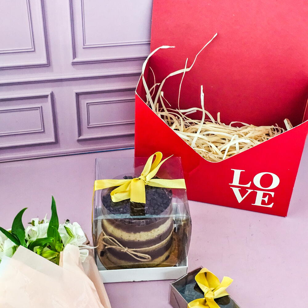 1 naked cake 350gr de baunilha com brigadeiros 2 brigadeiros 1 mini buque de astromélias Embalagem tipo carta com palha decorativa.