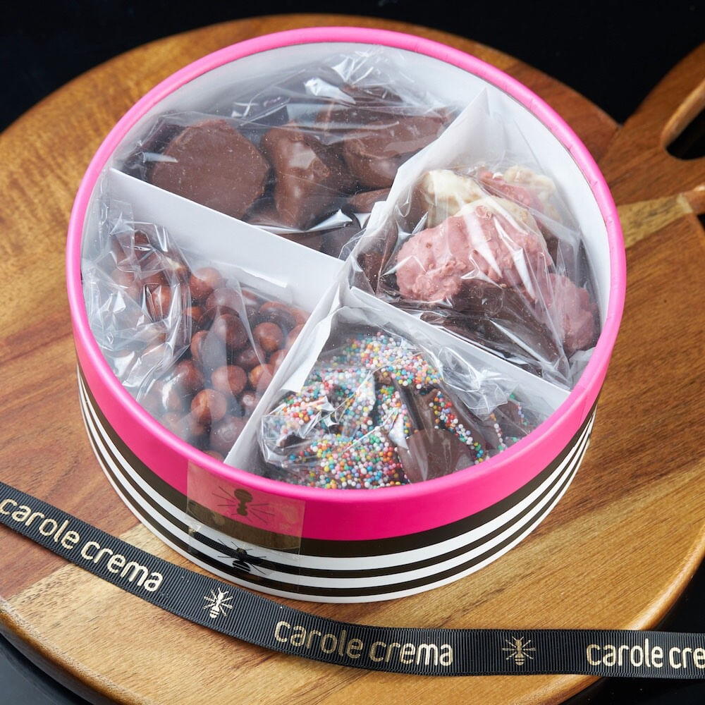 Que tal presentear com uma caixa contendo diversas delícias da Carole? Esta é a Caixa Delícias. Ela contém as famosas pepitas de honeycomb, gotas de chocolate ao leite com miçangas, croc crunch, e as delícias pearls da Callebaut, elaboradas com o melhor chocolate! Peso aprox: aprox