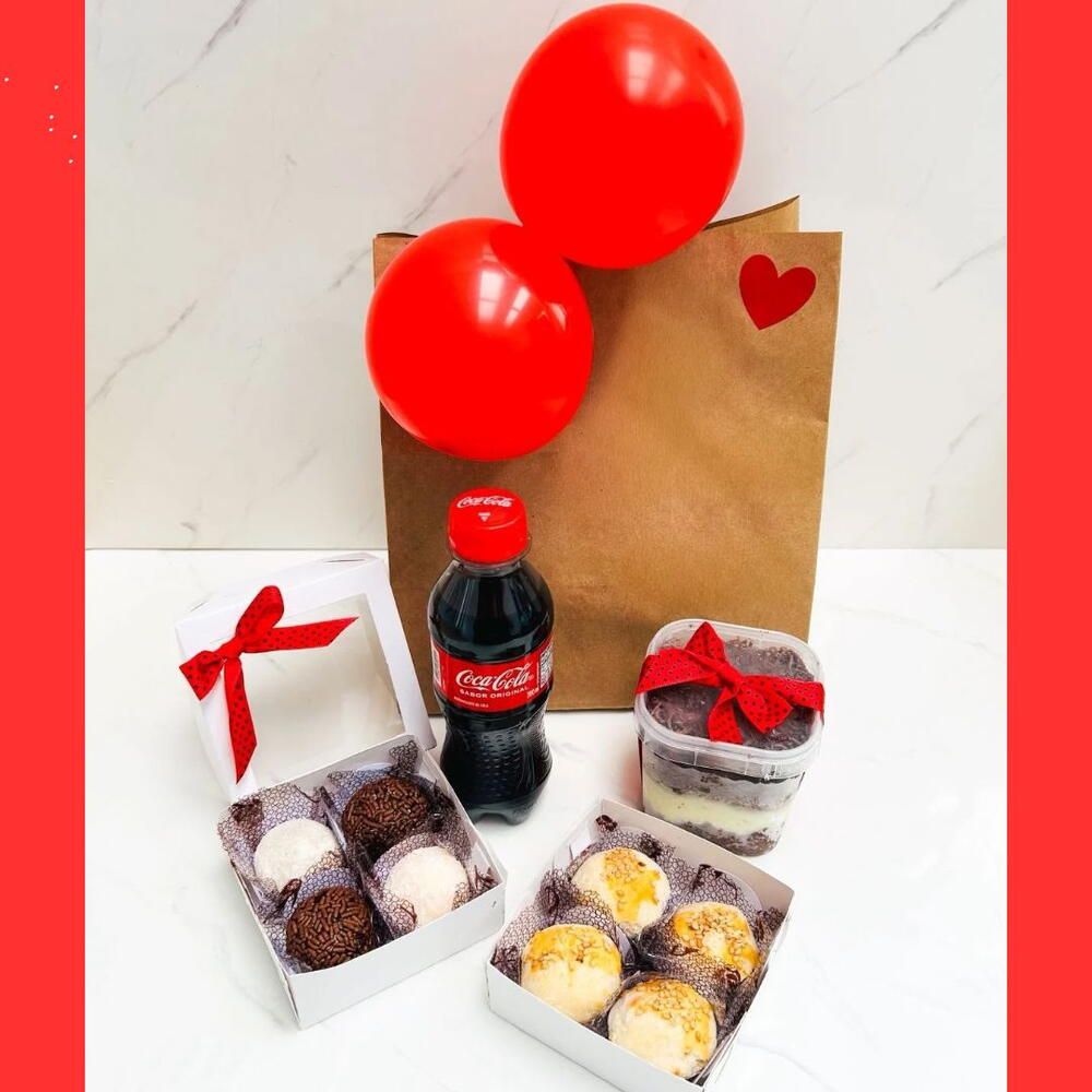 4 Brigadeiros Gourmet 4 Empadas 1 Bolo de (Pote Brigadeiro ou Prestígio) 1 Mini Coca Cola Duas Bexigas