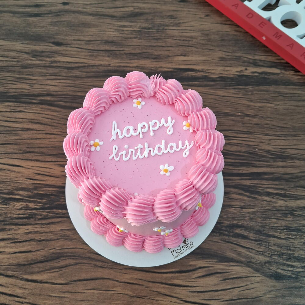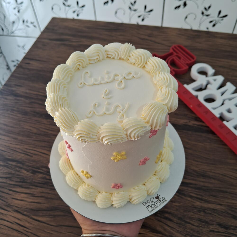 Mini bolo para comemorações intimistas Rende aprox. 6/8 fatias generosas Decoração com bico de confeitar e escrita no topo do bolo