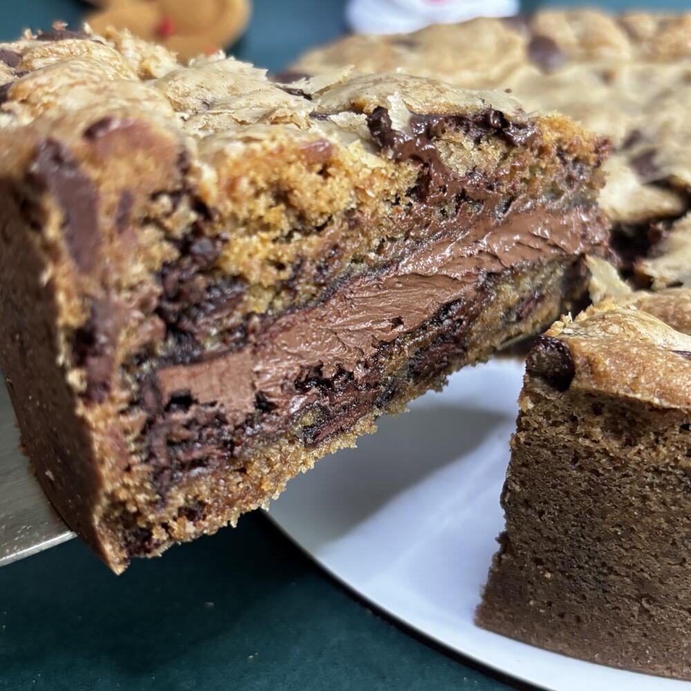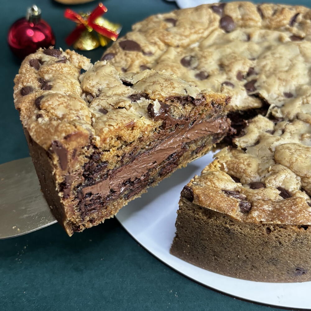 Torta cookie bem macia por dentro, crocantinha por fora e transbordando Nutella cremosa. Uma explosão de chocolate em cada mordida