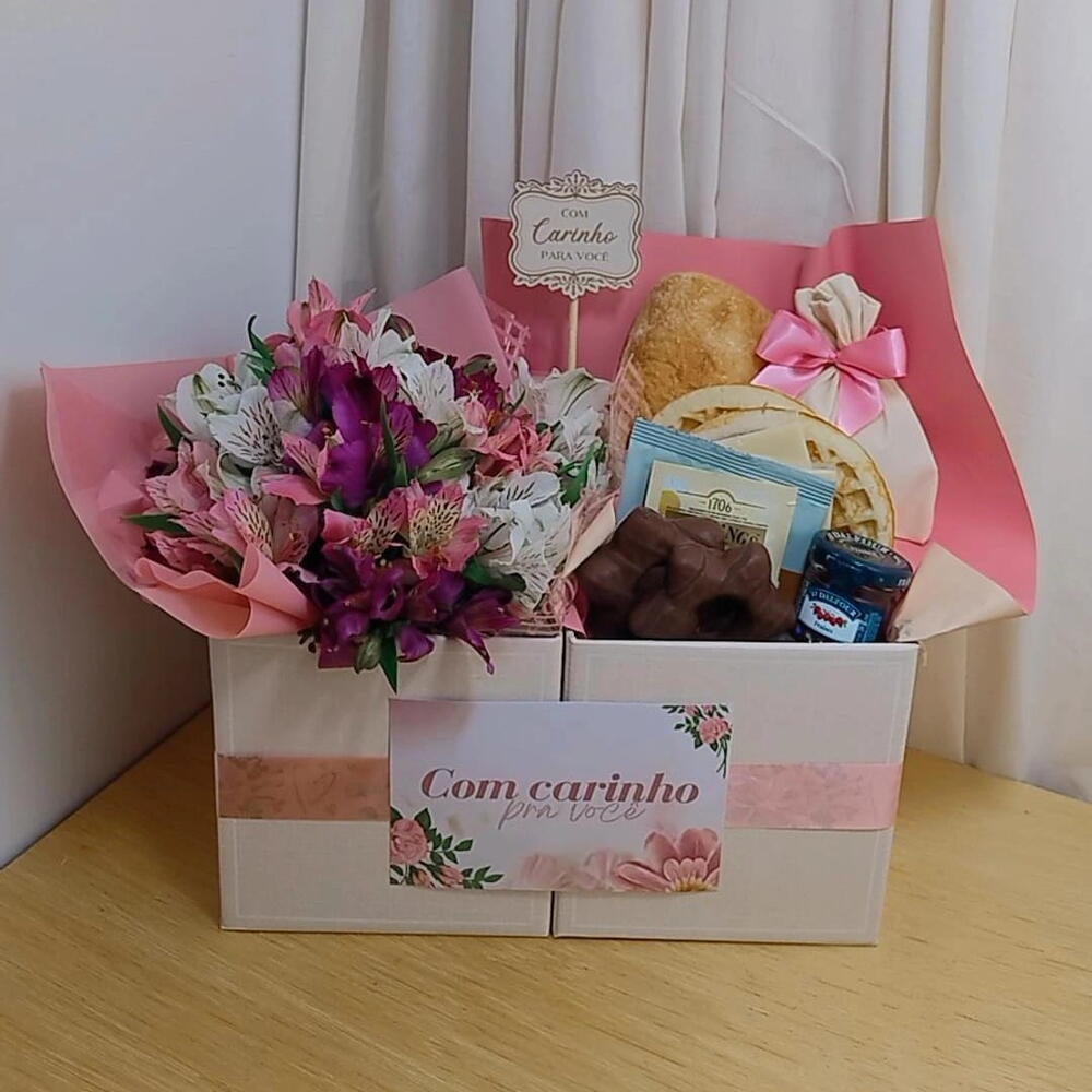 chá twinings - 1 pcs waffles - 2 pcs pães de mel - 2 pcs pacote de biscoitos amanteigados - 1 pcs caixa decorada com fita e tag com carinho - 1 pcs 1 arranjo de flores naturais ( alstromelias ) - 1 pcs pão tipo ciabatta - 1 pcs plaquinha em mdf "com carinho" - 1 pcs cappuccino santa mônica - 1 pcs mini geleia importada dalfour - 1 pcs queijo polenghifatiado - 3 pcs