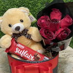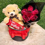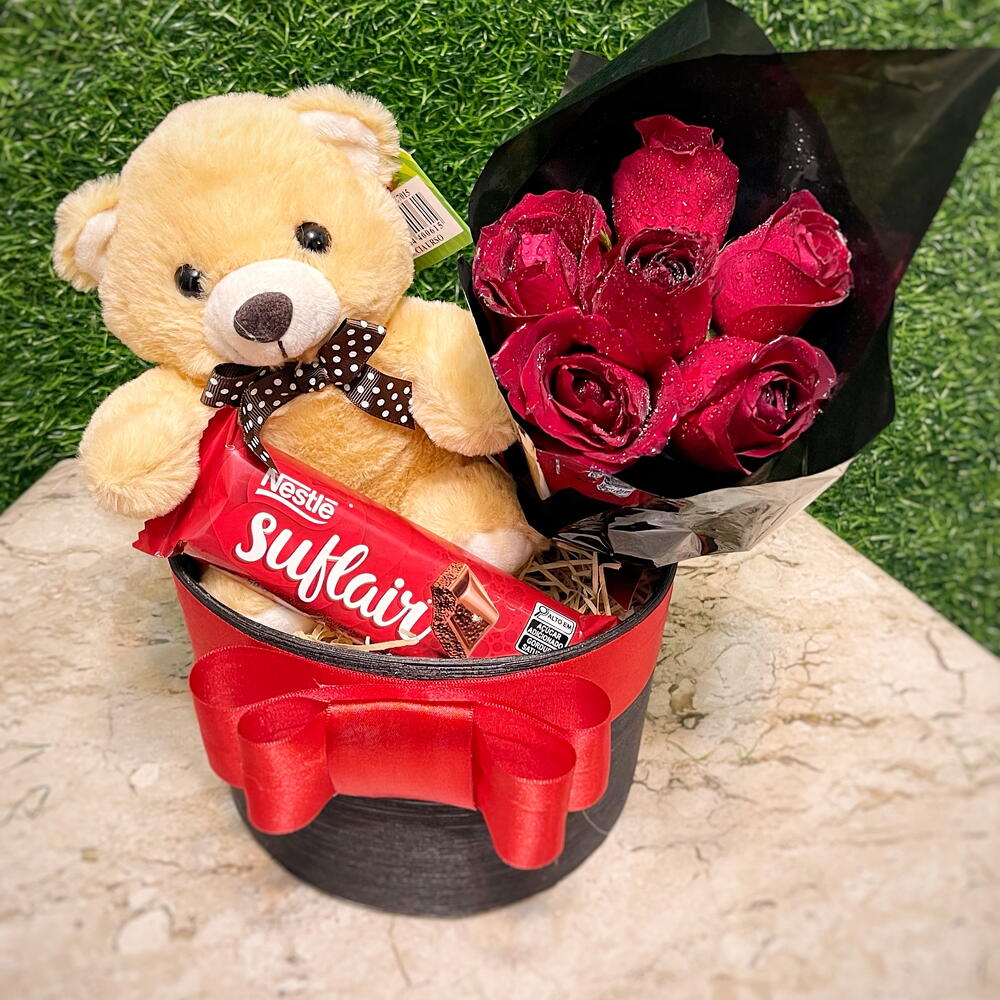 Este conjunto encantador é o presente perfeito para qualquer ocasião. Composto por uma unidade de pelúcia macia e aconchegante, um delicioso chocolate suflair que derrete na boca e um buquê de seis rosas vermelhas exuberantes, todos cuidadosamente embalados em uma caixa decorada com um elegante laço. Esta combinação de flores, chocolate e carinho é a maneira perfeita de expressar seu afeto. Obs: Cor do cachepo pode mudar conforme disponibilidade.