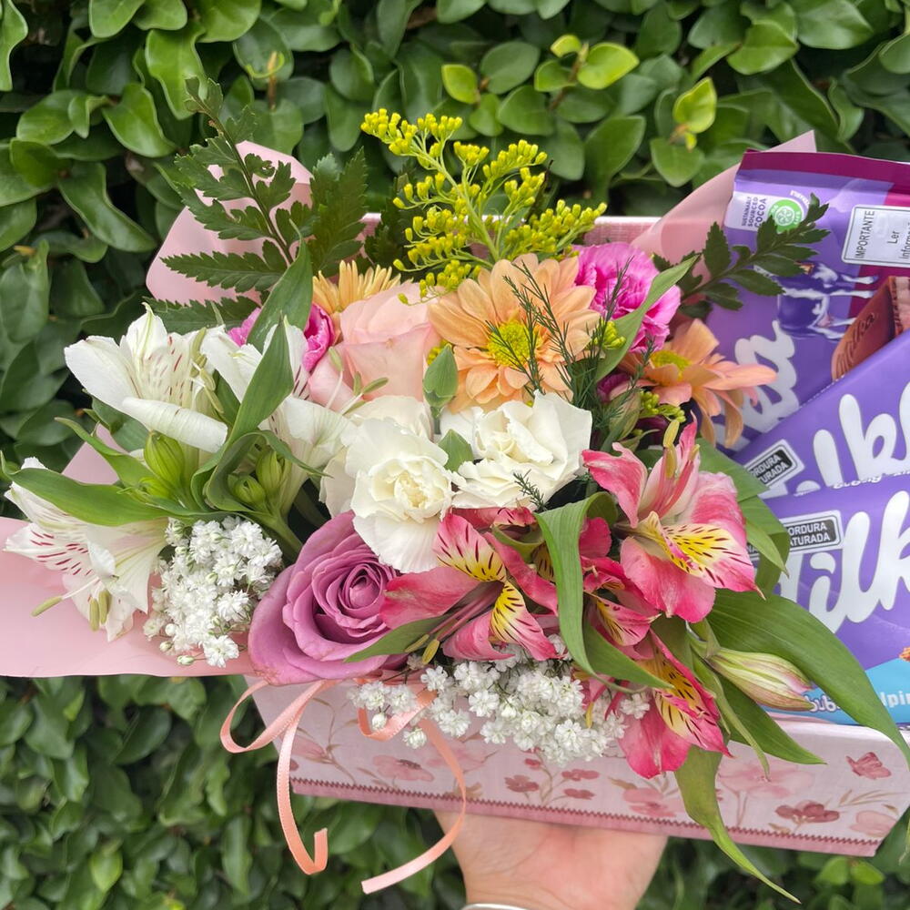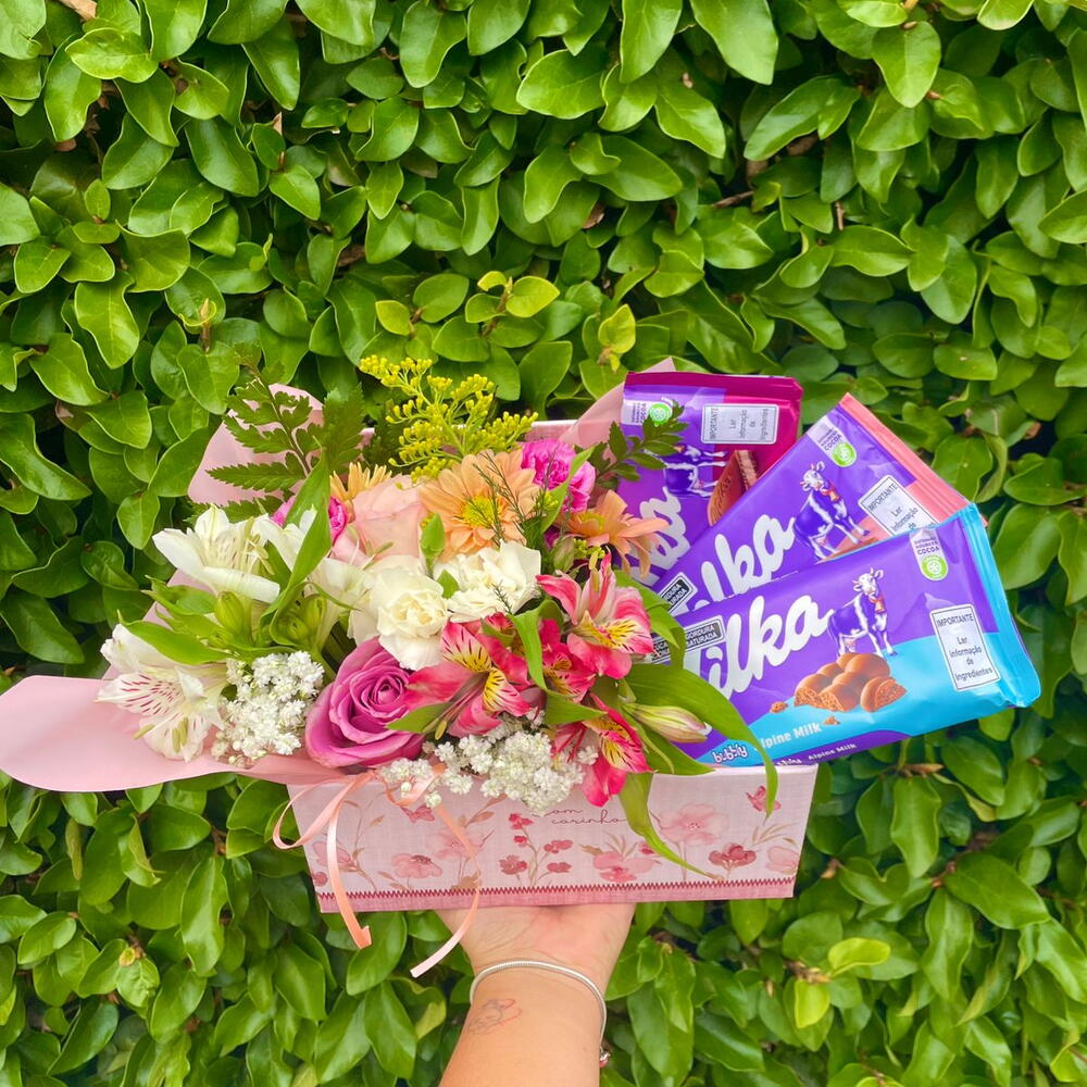 Este charmoso conjunto é perfeito para ocasiões especiais! Inclui um belo mix de flores com 5 unidades variadas, ideais para adicionar um toque de frescor e cor ao ambiente. Acompanha uma encantadora caixa cuidadosamente preparada com todo amor e carinho, assim como três barras variadas de chocolate Milka, reconhecido pela sua deliciosa e cremosa textura. Ideal para presentear e surpreender alguém especial!