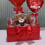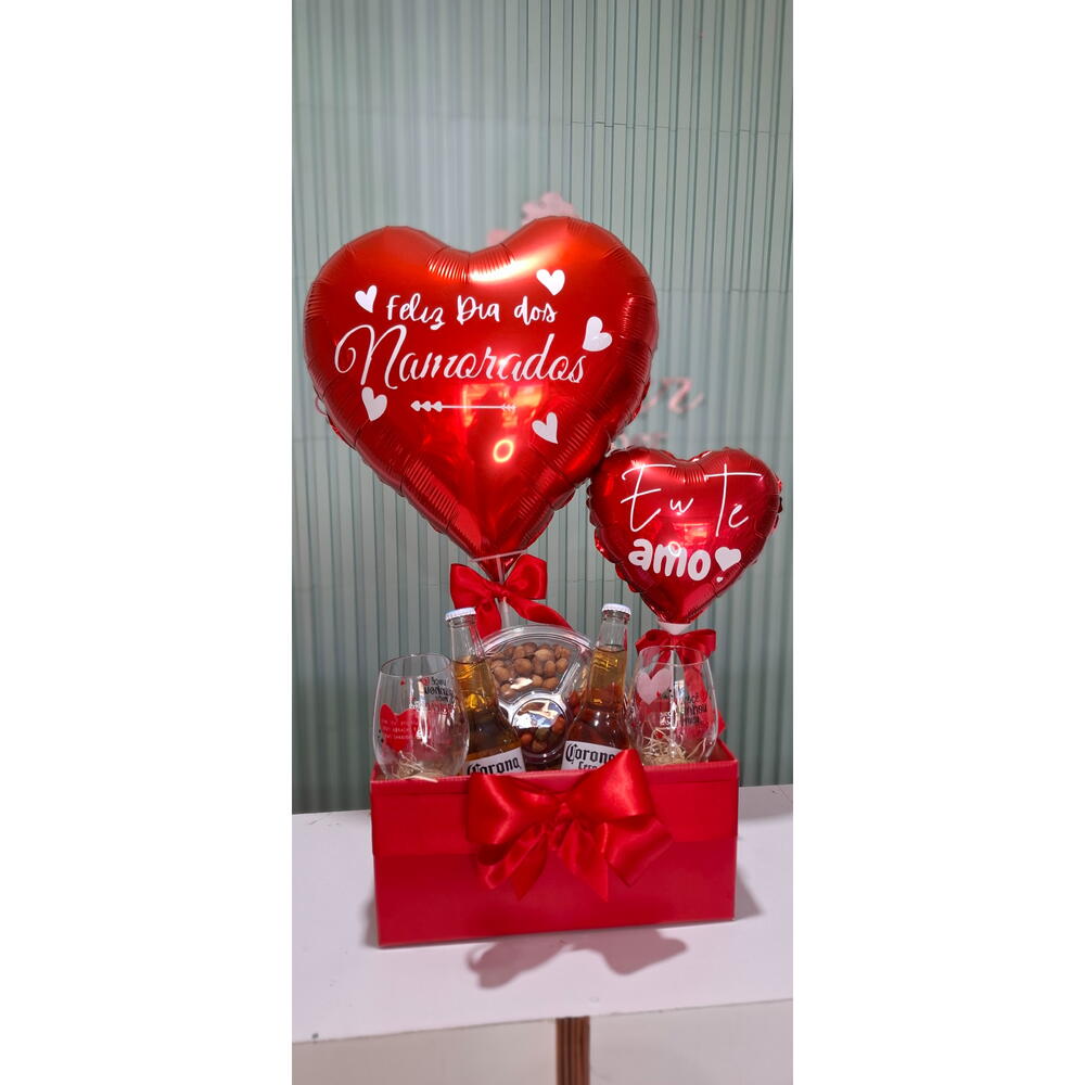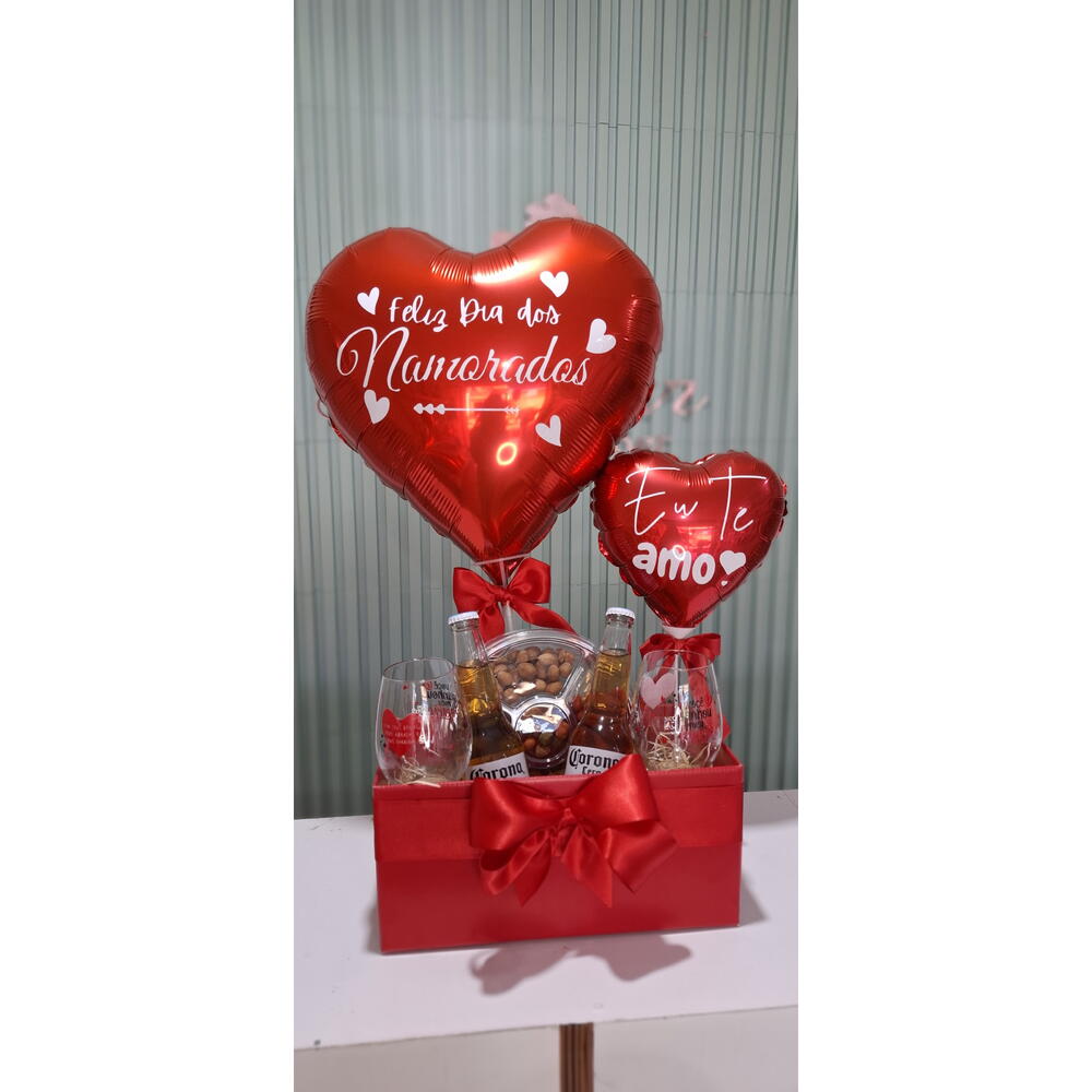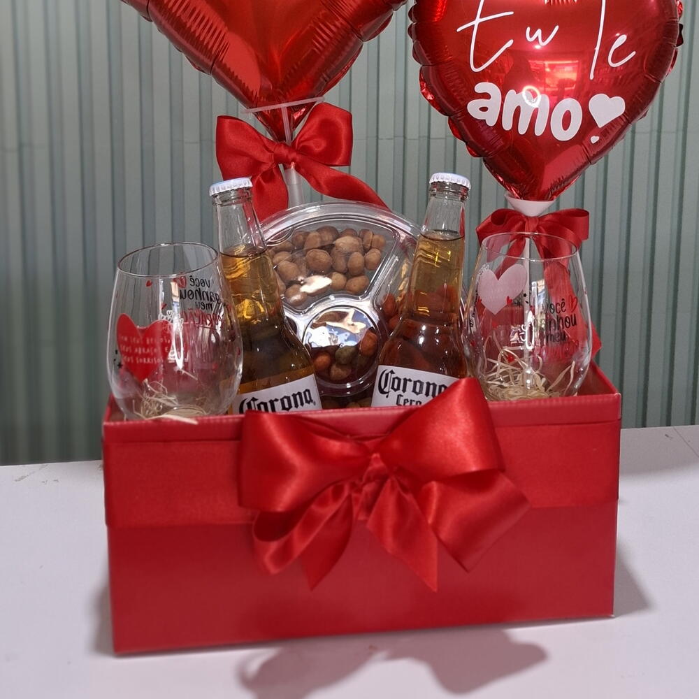 cervejas corona - 2 pcs taças vidro - 2 pcs petiscos amendoim - 1 pcs balão personalizado 18 - 1 pcs balão personalizado coração 10 - 1 pcs caixa cartonada vermelha - 1 pcs