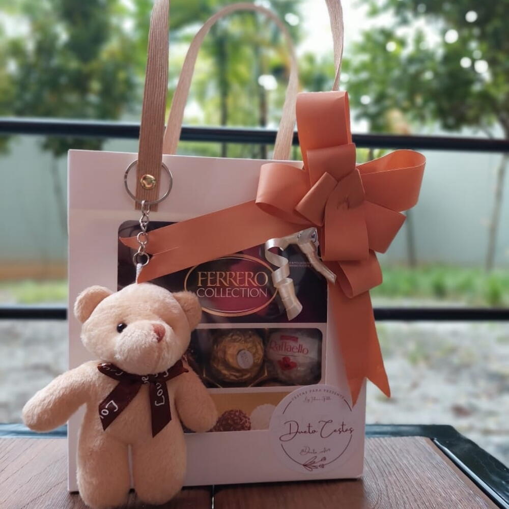 laço decorativo - 1 pcs ferrero collection 77g - 1 pcs pelucia chaveiro - 1 pcs bag branca com alça - 1 pcs algumas guloseimas extras - 5 pcs
