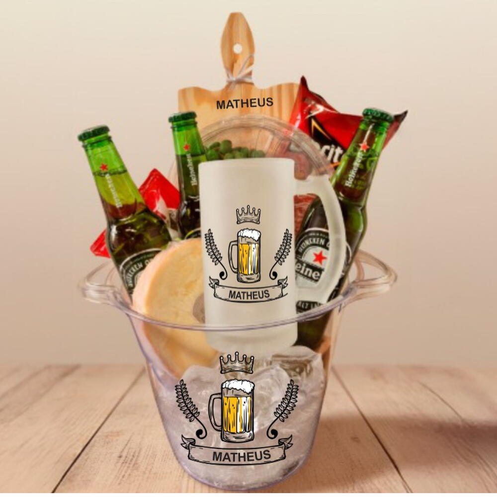 3 cervejas long neck Petisqueira com Mix de Amendoins: 50g de amendoim natural 50g de amendoim salsa cebola 50g de amendoim pimenta 50g de amendoim churrasco 50g de amendoim salgado 1 pacote de azeitona (80g) 1 pacote de salame (100g) 150g de queijo provolone 1 pacote de Doritos (22g) 1 tábua de madeira para frios personalizada com nome (tamanho 25x14,5 cm) 1 caneca de chopp em vidro personalizada 1 cartão de dedicatória personalizado (com mensagem enviada) 1 balde em acrílico personalizado (tamanho 5L, 26x19 cm)
