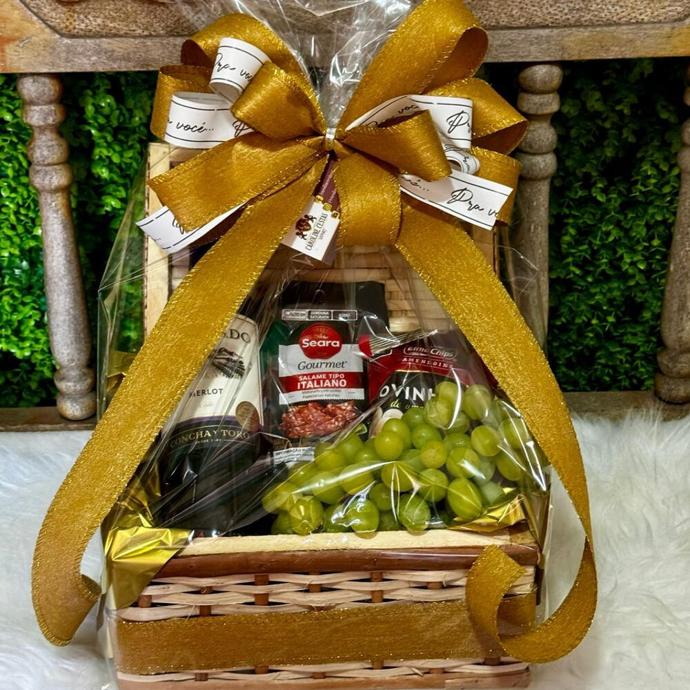 Este elegante presente contém uma variedade de delícias requintadas perfeitamente arranjadas em um baú de madeira rústica. O conjunto inclui uma garrafa de vinho tinto Merlot, reconhecido pela sua qualidade superior, um cacho de uvas sem sementes selecionadas para uma experiência de sabor natural e refrescante, e para os amantes de charcutaria, 100gr de salame italiano fatiado da Seara. Além disso, inclui uma porção de amendoins Elma Chips para um crocante e delicioso lanche e para finalizar, a embalagem é cuidadosamente selada com celofane e enfeitada com um laço, garantindo um aspeto visual cativante. Este presente é a combinação perfeita de sabores para qualquer ocasião especial.