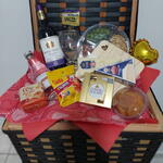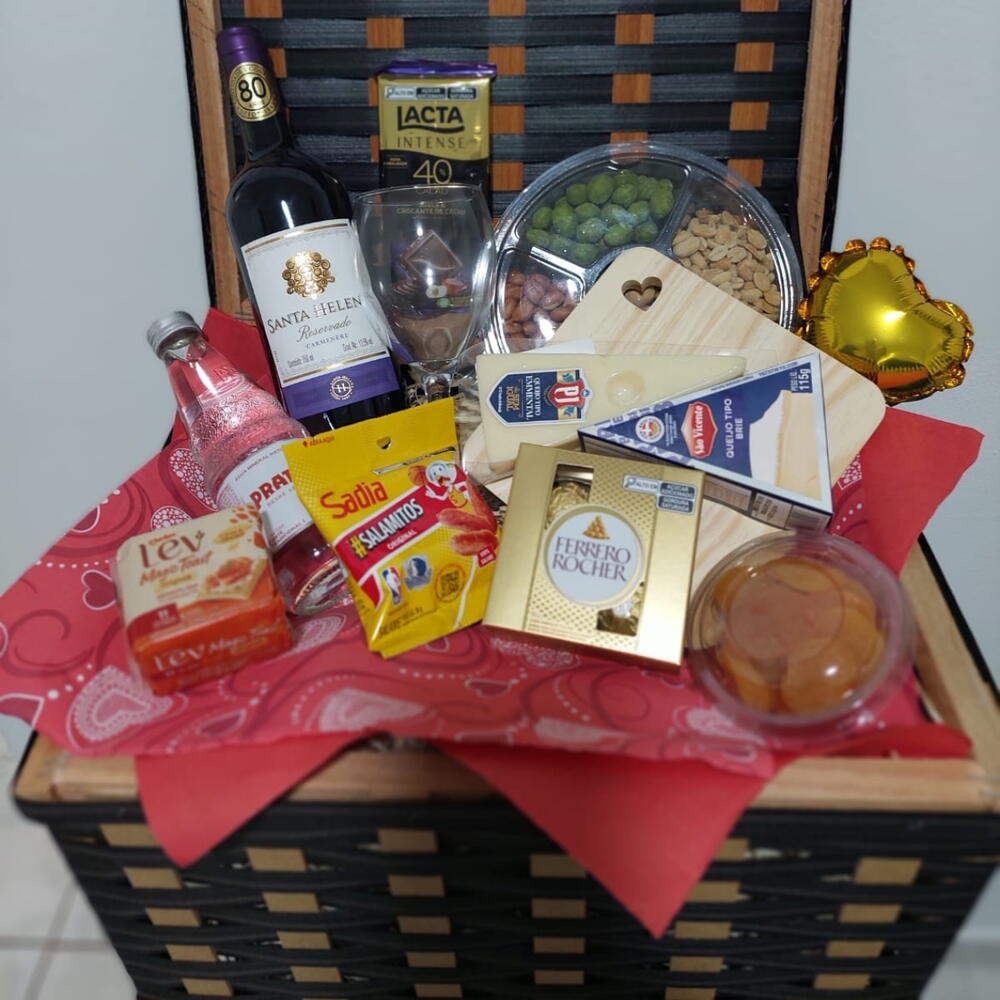 damasco - 1 pcs queijo brie - 1 pcs salamitos sadia 36g - 1 pcs mini tábua de frios - 1 pcs barra chocolate - 1 pcs baú de vime (m) (32x22x15cm) - 1 pcs queijo gorgonzala - 1 pcs petisqueira com variedades de amendoim - 1 pcs taça de vinho de vidro - 1 pcs ferrero rocher com 4 bombom - 1 pcs vinho chileno grande - 1 pcs água de prata (garrafinha) - 1 pcs