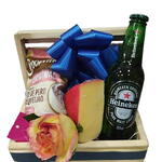 Este presente chique e saboroso inclui uma garrafa refrescante de Heineken com 250ml, perfeita para ser apreciada gelada em um dia quente. Acompanha um suculento queijo Gouda holandês com 100g, que é divinamente rico e cremoso. Mas a diversão não para por aí, o lanche fica ainda mais delicioso com um Crocantíssimo de 40g. Para finalizar o conjunto, uma rosa sofisticada adiciona um toque romântico ao presente. Todos esses itens vêm em um baú encantador que certamente fará o destinatário se sentir especial.
