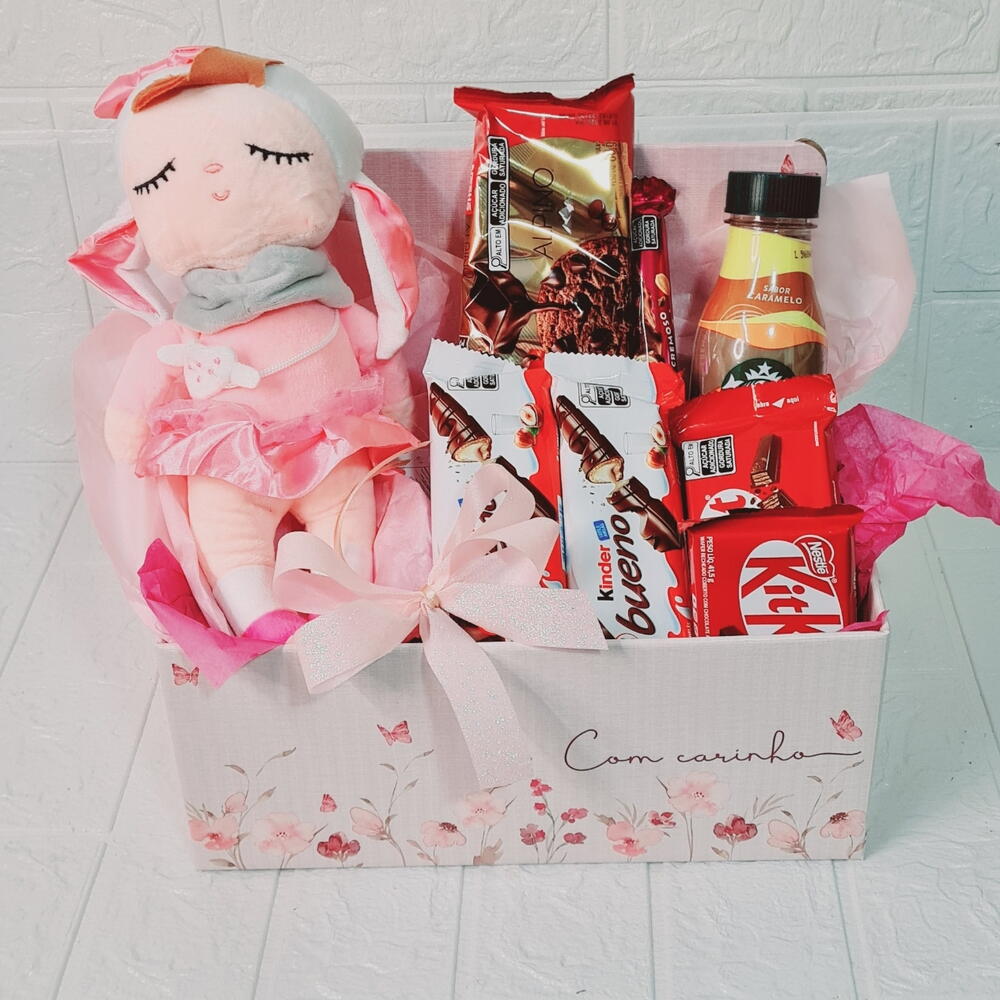 kinder bueno - 1 pcs cookies - 1 pcs kitkat - 1 pcs barrinha lacta - 1 pcs achocolatado starbucks 280 ml - 1 pcs boneca 24 cm - 1 pcs