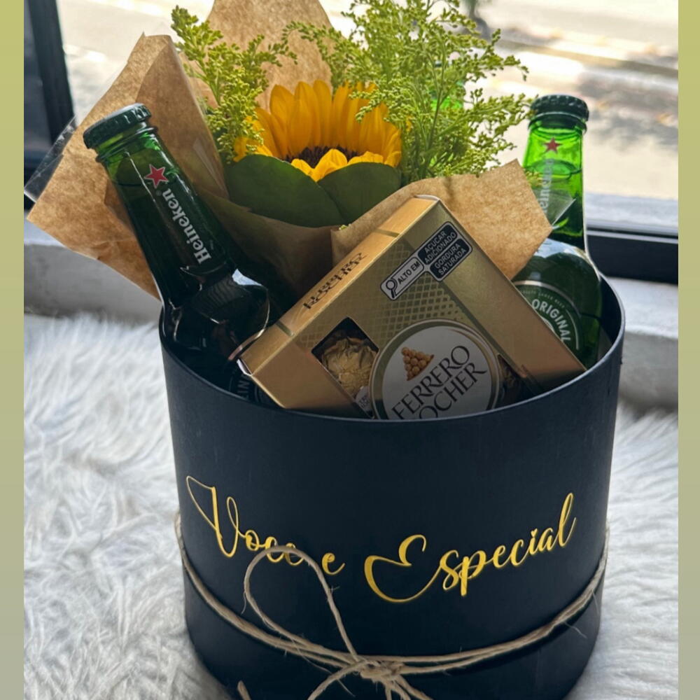 Um presente que une sabor, beleza e um toque de natureza: 🎁 1 Box Personalizada com acabamento especial 🍻 2 Cervejas geladinhas para celebrar 🍫 1 Ferrero Rocher com 4 bombons – doçura e sofisticação 🌻 1 Girassol radiante para iluminar o dia de quem recebe Perfeito para comemorações, surpresas especiais ou para transformar qualquer momento em algo inesquecível! ✨