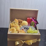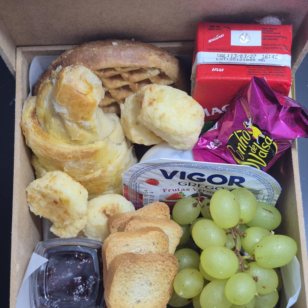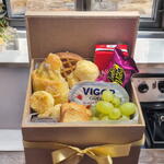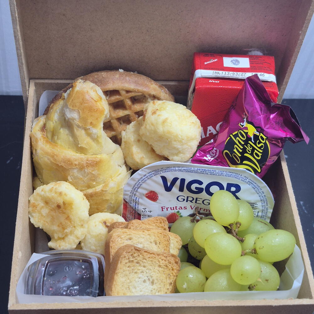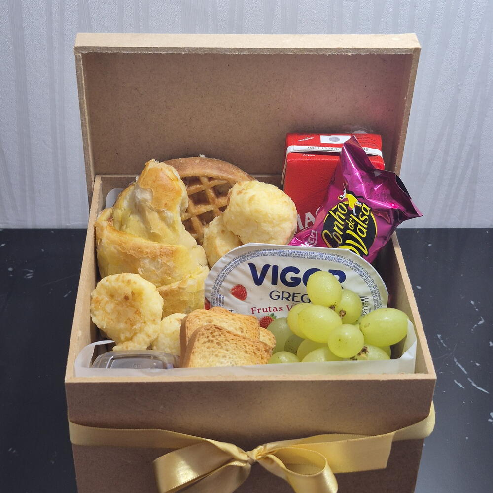 croissant - 1 pcs torradas - 10 pcs bombom - 1 pcs waffle - 1 pcs uvas frescas - 1 pcs caixa mdf - 1 pcs iorgute grego - 1 pcs pães de queijos - 5 pcs geleias importada - 1 pcs suco dela vale - 1 pcs
