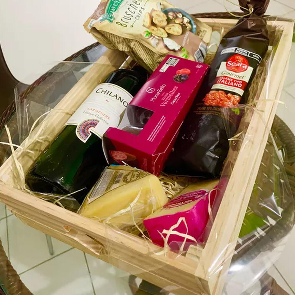 laço - 1 pcs tipos de queijos - 2 pcs salame tipo italiano - 1 pcs palha decorativa - 1 pcs embalagem celofane - 1 pcs garrafa de vinho chileno - 1 pcs bandeja em madeira - 1 pcs pacote aperitivo - 1 pcs unidades marshmallow - 3 pcs