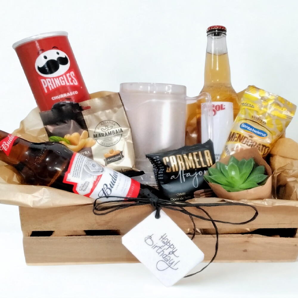 batata pringles - 1 pcs cervejas especiais - 2 pcs caneca gel 500ml - 1 pcs amendoim 60gr - 1 pcs cx madeira - 1 pcs cacto ou suculenta pote 11 - 1 pcs castanha 50 gr - 1 pcs