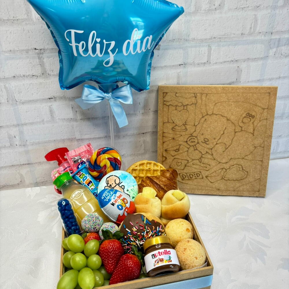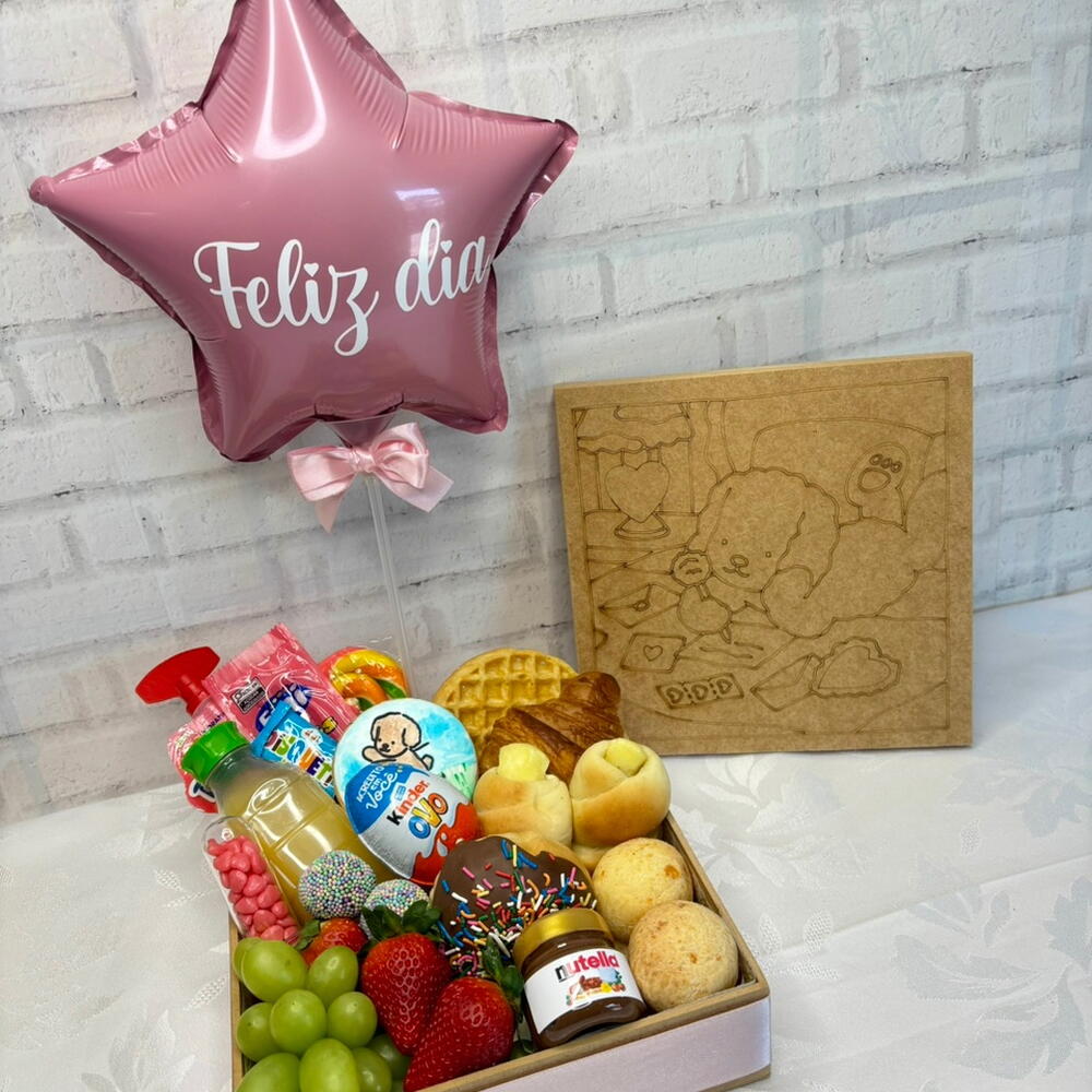croissant - 1 pcs pão de queijo - 2 pcs waffles - 1 pcs pães - 2 pcs suco 200ml - 1 pcs donut - 1 pcs brigadeiros gourmet - 2 pcs frutas frescas - 2 pcs mini nutella - 1 pcs balão feliz dia - 1 pcs guloseimas diversos - 6 pcs placa mdf para colorir - 1 pcs