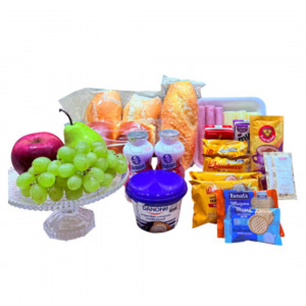 iogurte - 1 pcs polenguinho - 1 pcs sachê de café solúvel - 2 pcs requeijão - 1 pcs torradas bauducco - 2 pcs tipos de pães - 3 pcs sachê de açúcar - 1 pcs bolachinhas bauducco - 2 pcs achocolatado - 1 pcs tipos de frutas da época - 2 pcs sucos 200 ml - 1 pcs frios (muçarela e presunto) - 1 pcs embalagem de madeira para viagem - 1 pcs