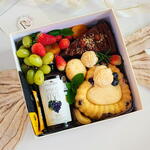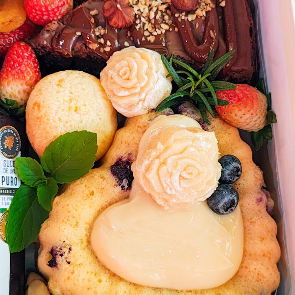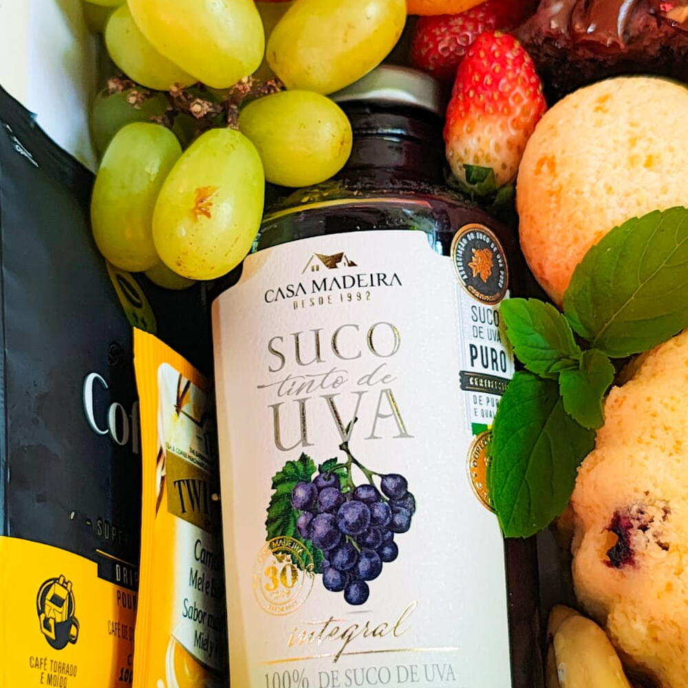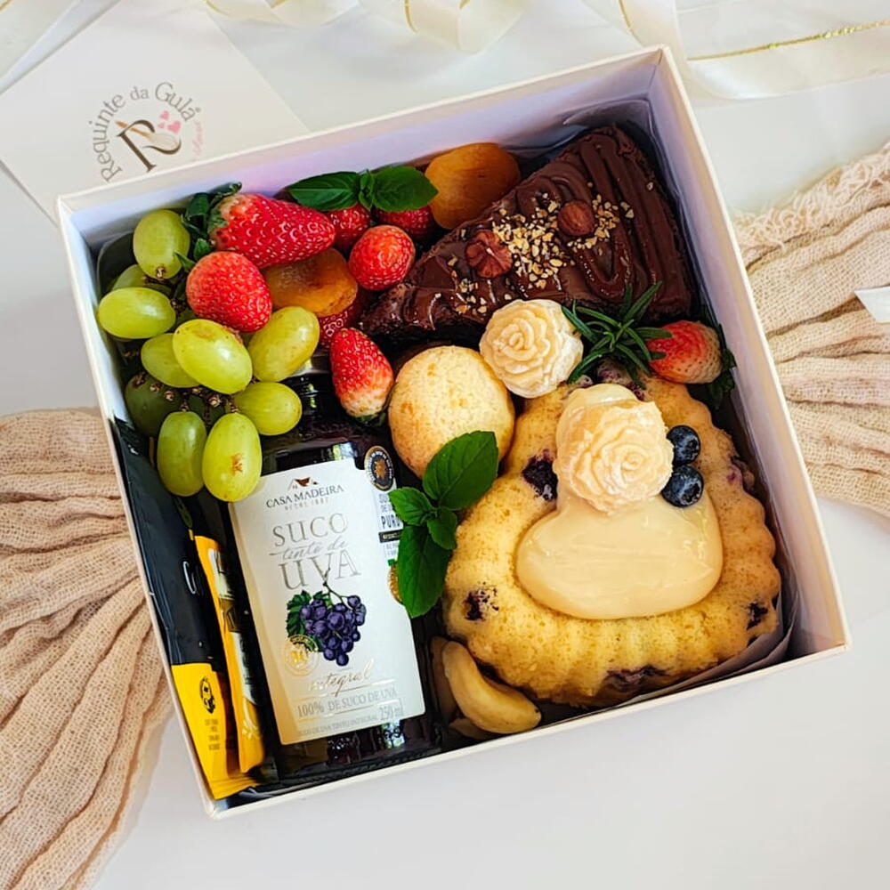 caixa cartonada - 1 pcs morangos - 6 pcs saco celofane - 1 pcs chá inglês - 1 pcs damascos - 2 pcs porção de uvas - 1 pcs laço em cetim - 1 pcs brigadeiro em flor - 2 pcs fino cartão de mensagem - 1 pcs café drip coffee especial - 1 pcs fatia de bolo recheado ferrero rocher - 1 pcs suco de uva premium casa madeira - 1 pcs castanhas e amêndoas - 8 pcs pão de queijo artesanal - 2 pcs bolo caseiro gourmet - 1 pcs